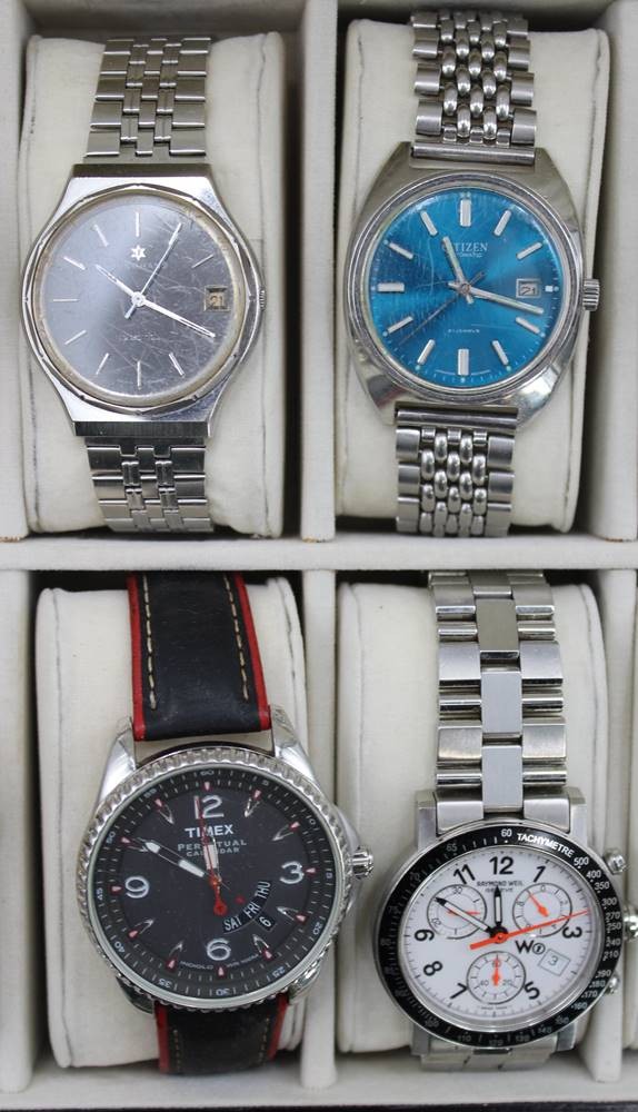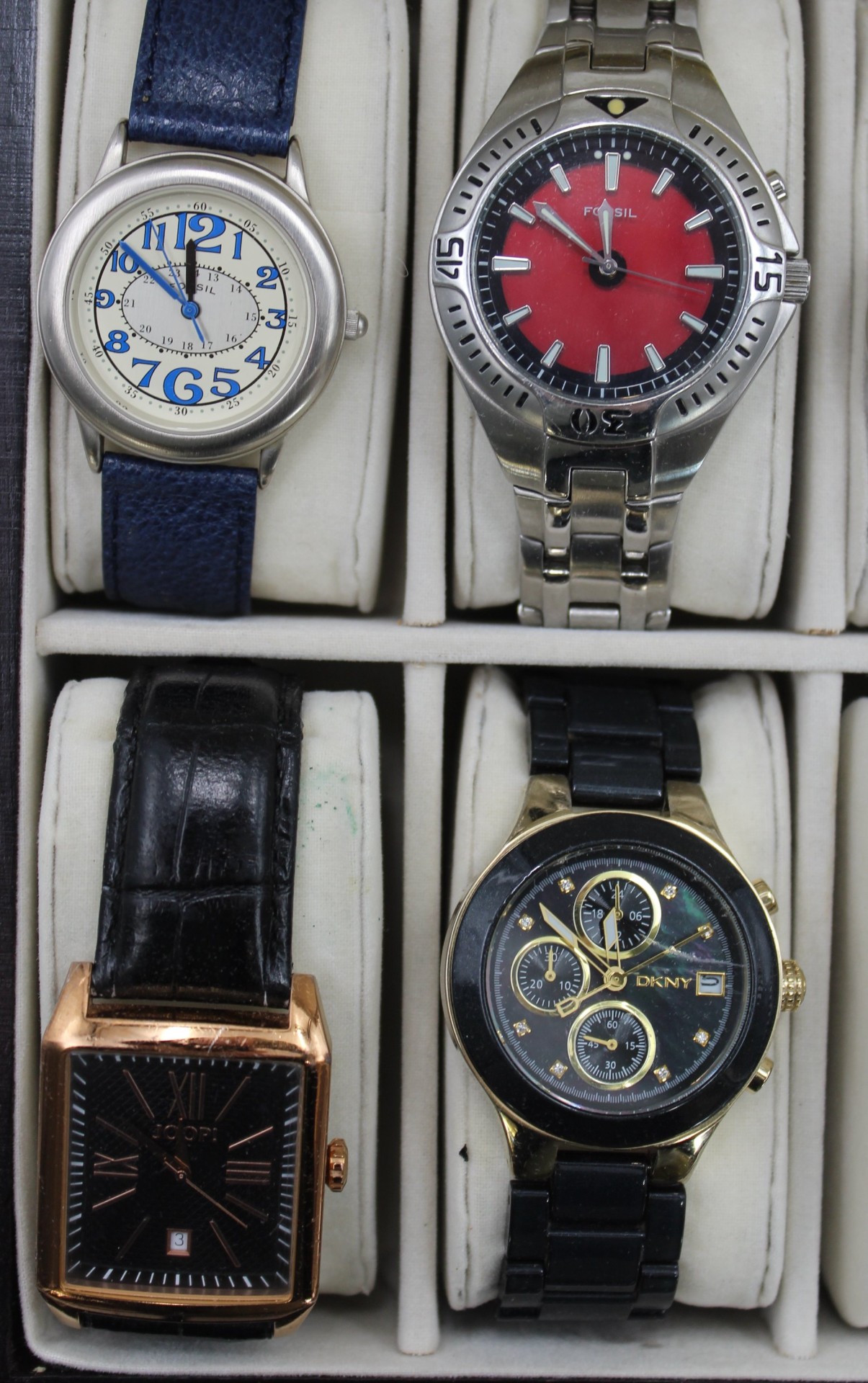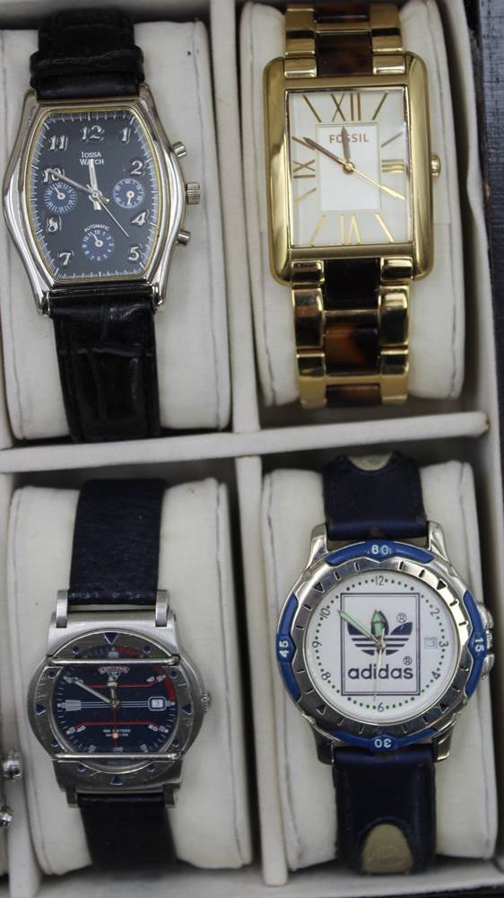 Kasten mit 12 div. Armbanduhren, u.a. Adidas, DKNY, Fossil, Joop etc., Ouarzwerke, 1x Citizen Automatic (läuft) [1]