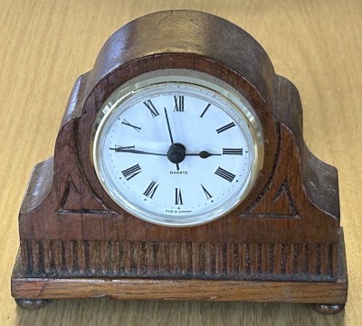 kl. Buffetuhr, altes Holzgehäuse mit neuen Quartzwerk, rückseitig fehlt ein Fuss, H-11,5 cm, B-13,5 cm [1]