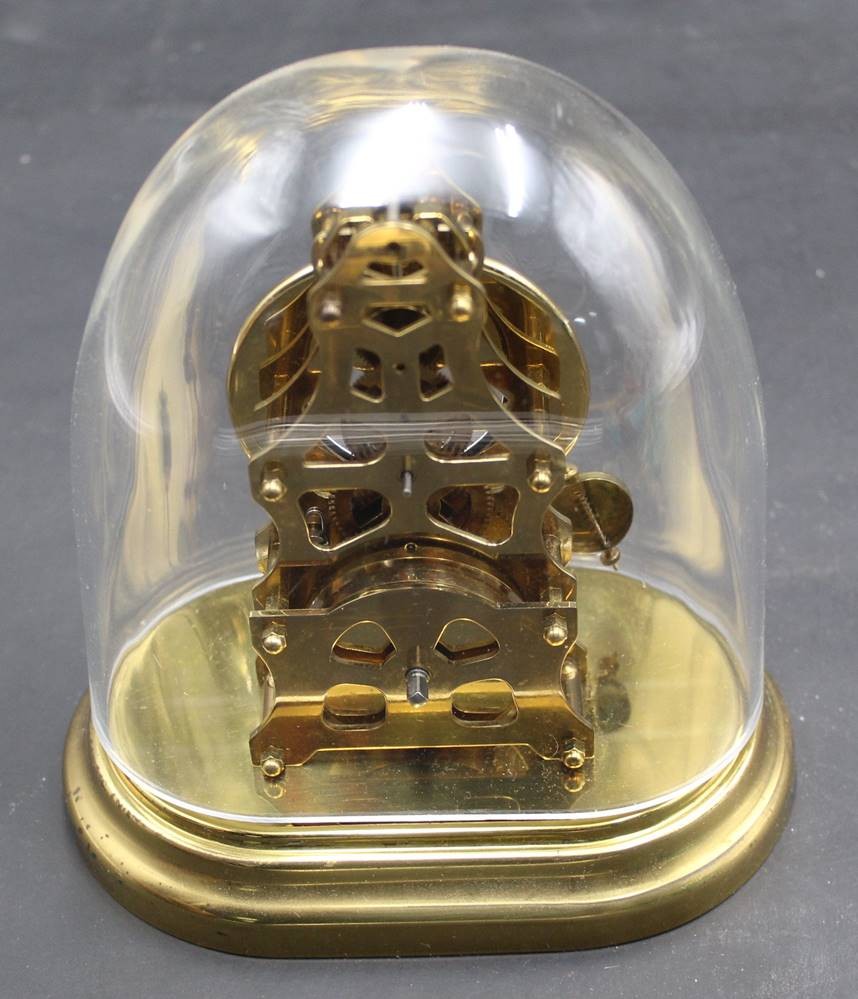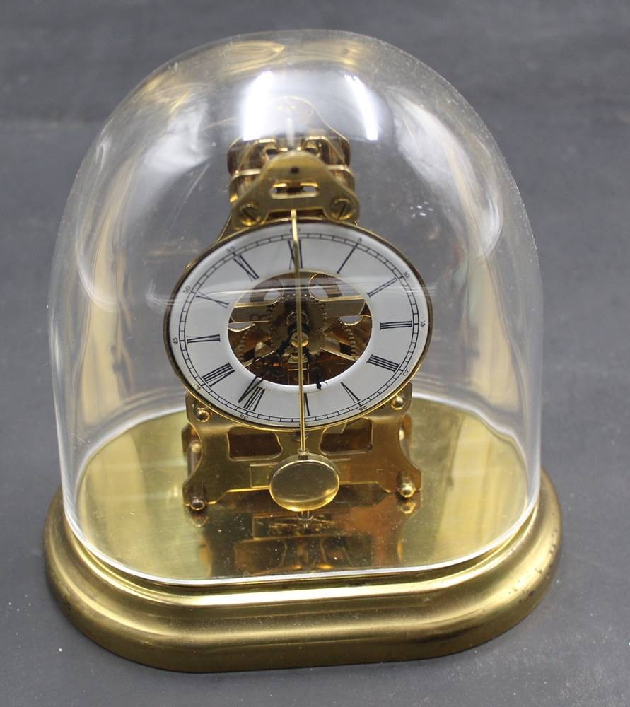 kl. Kommodenuhr, sog. Zappler, mit Plastiksturz, Schlüsselwerk läuft, H-16 cm, B-14 cm [1]