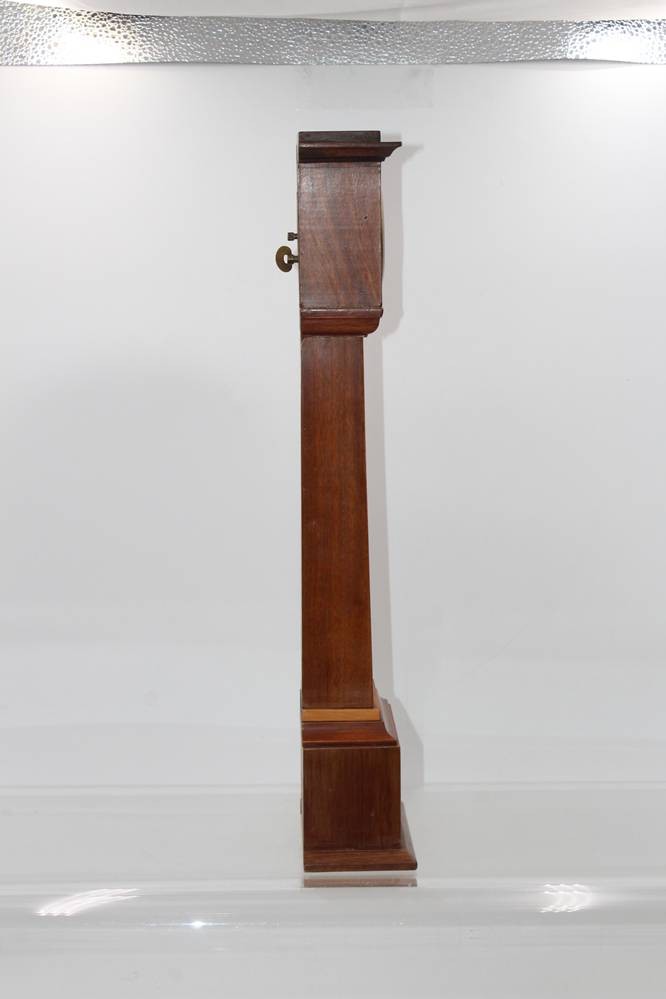 kl. Modell-Standuhr, Holz intarsiert, Werk läuft, H-42 cm, B-unten 12 cm, eine Seitenleiste etwas beschädigt [1]