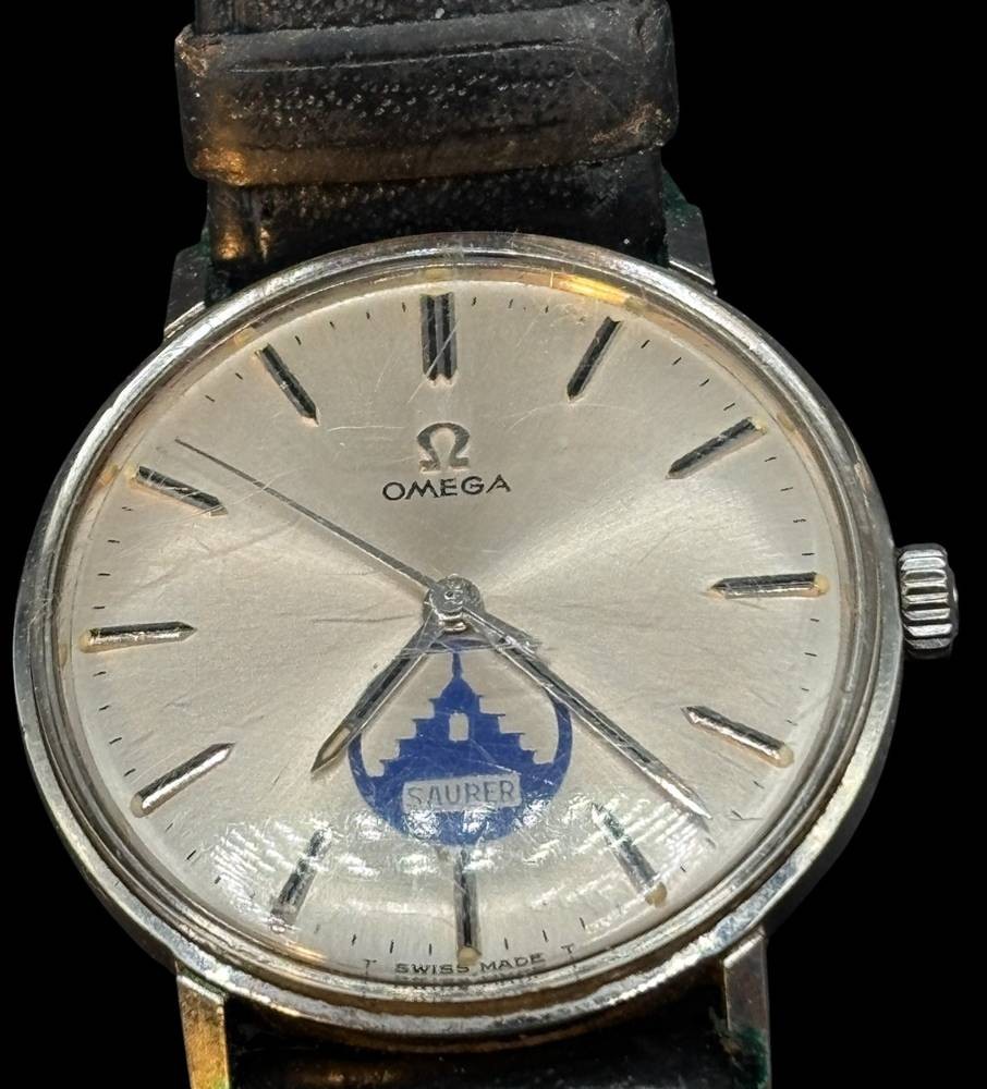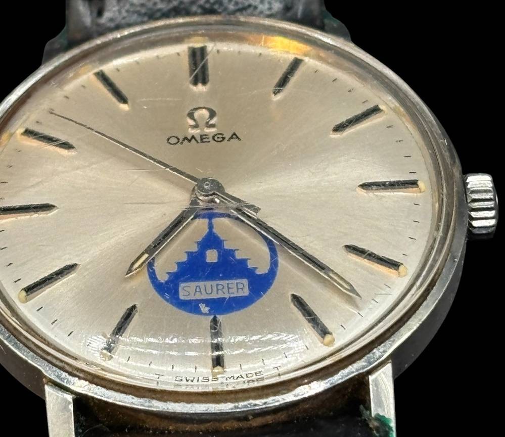 mechan. Handaufzug HAU "Omega" 135 019-Tool 106, Werbung für Saurer, Werk läuft, Lederband, leichte Tragespuren, 1968 [1]