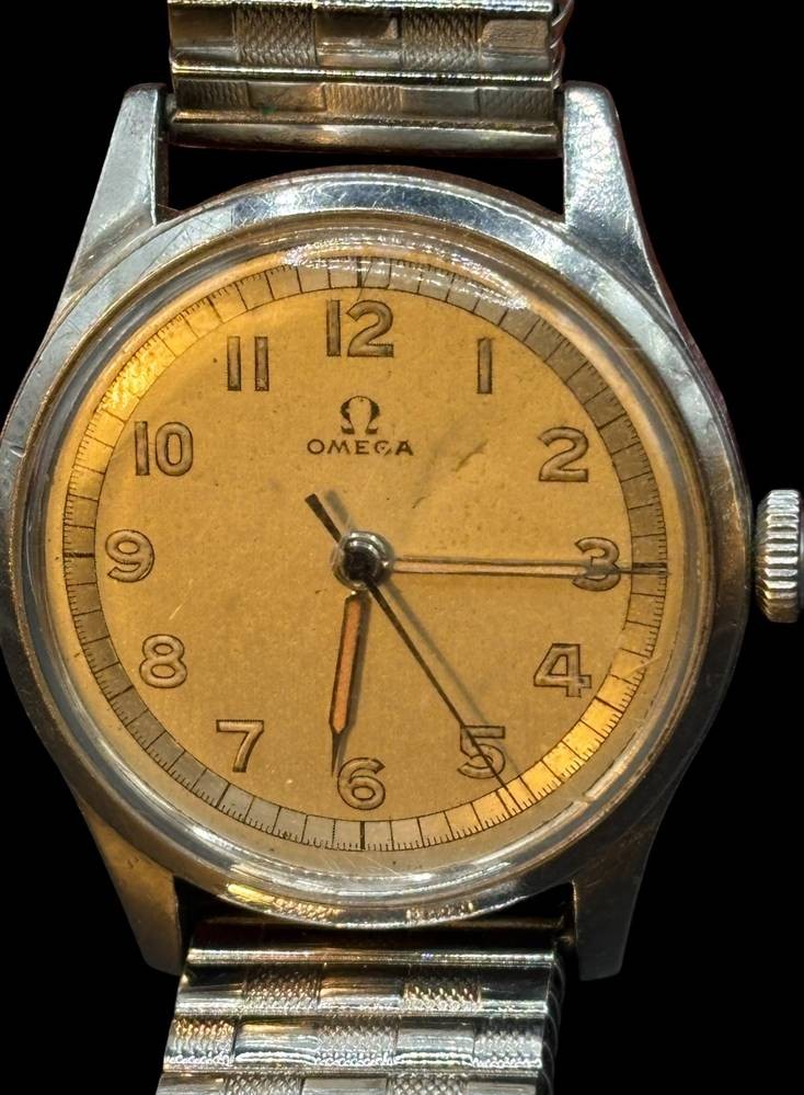 mechan. Handaufzug HAU "Omega" verso Gravur, datiert 1949, Zugarmband defekt,