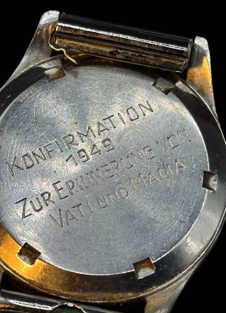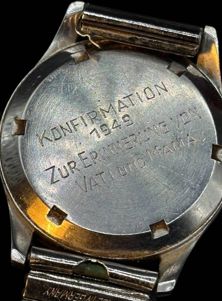 mechan. Handaufzug HAU "Omega" verso Gravur, datiert 1949, Zugarmband defekt, [1]