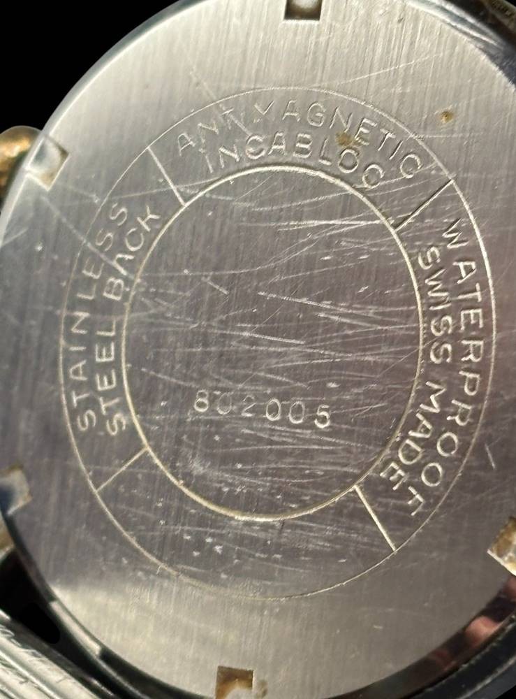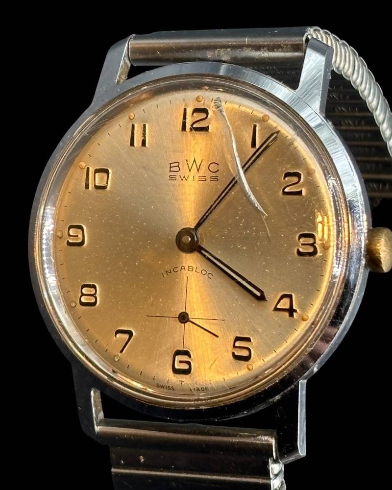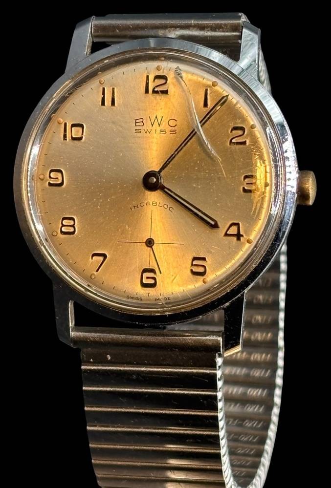 mechan HAU "BWC" Swiss (sog. Wehrmachtswerk) um 1965, Werk läuft, Metall Zugband, Glas mit Kratzer, ansonsten gut [1]