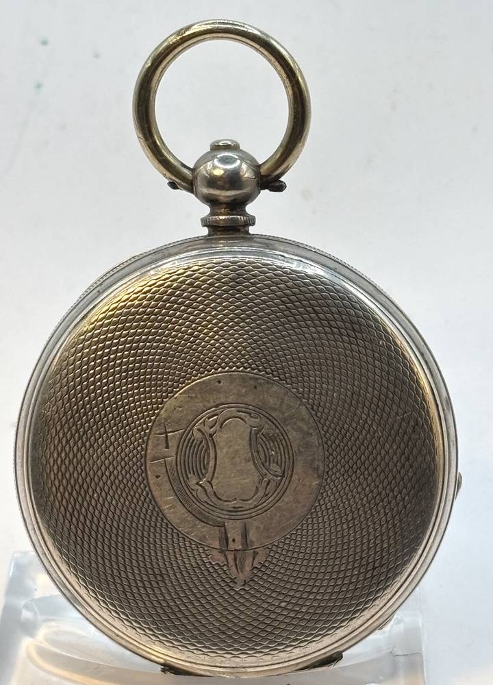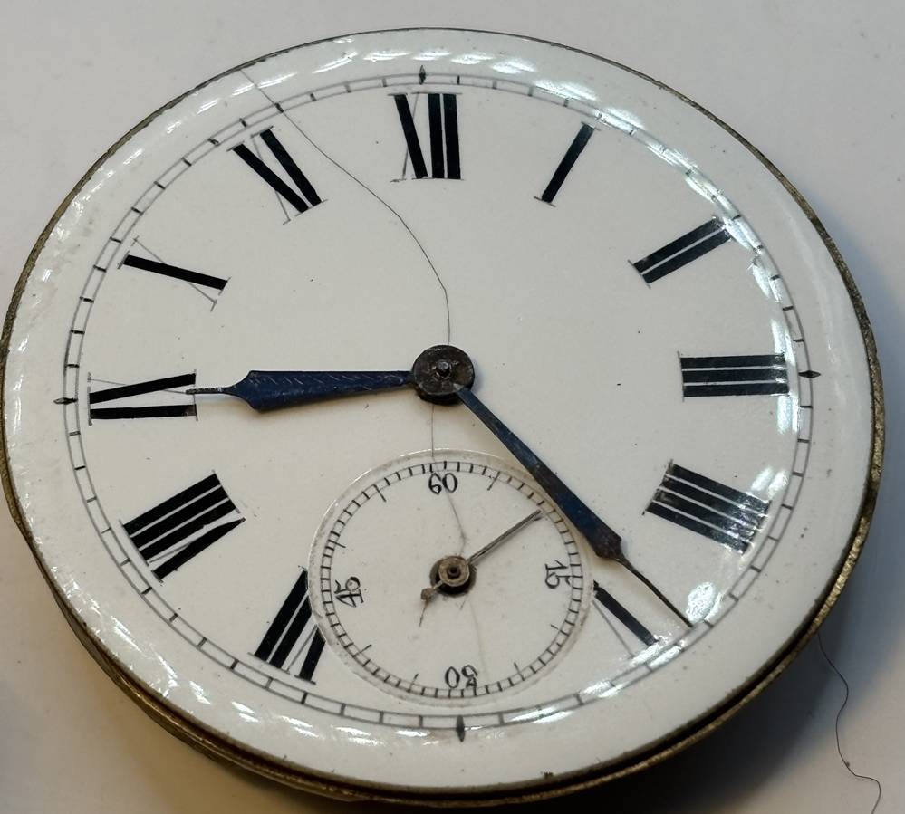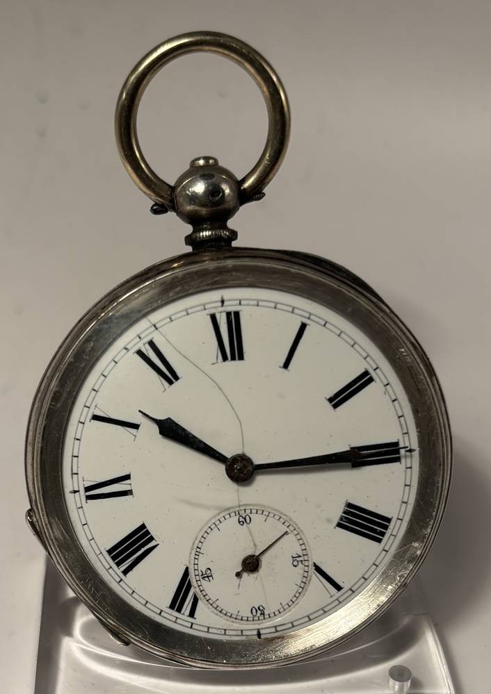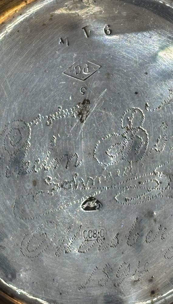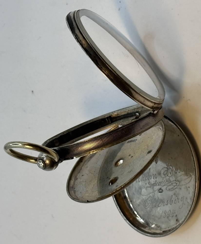 mechan. HTU in Silbergehäuse-800-, Schlüssel-Werk läuft, D-5 cm, Zifferblatt mit Riss, innen Gravur, datiert 1894 [1]