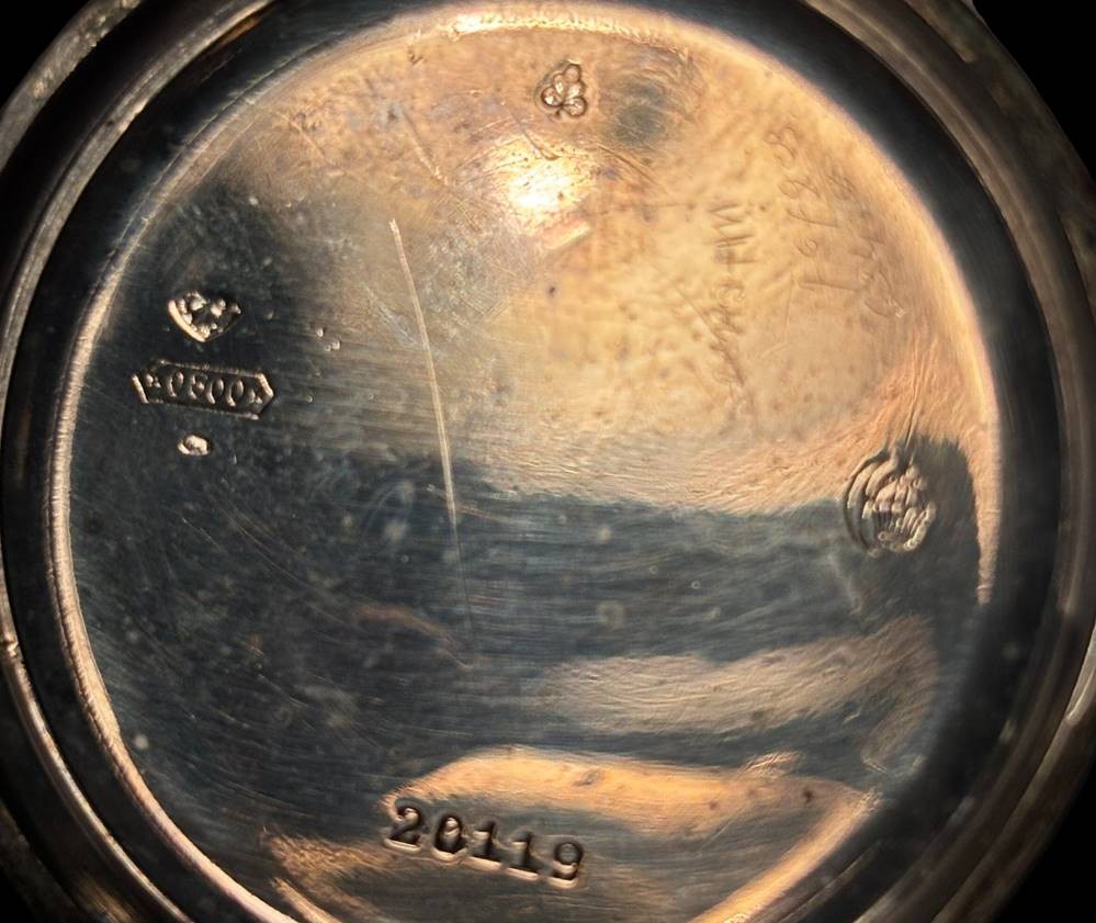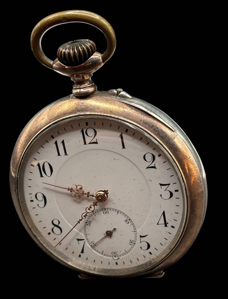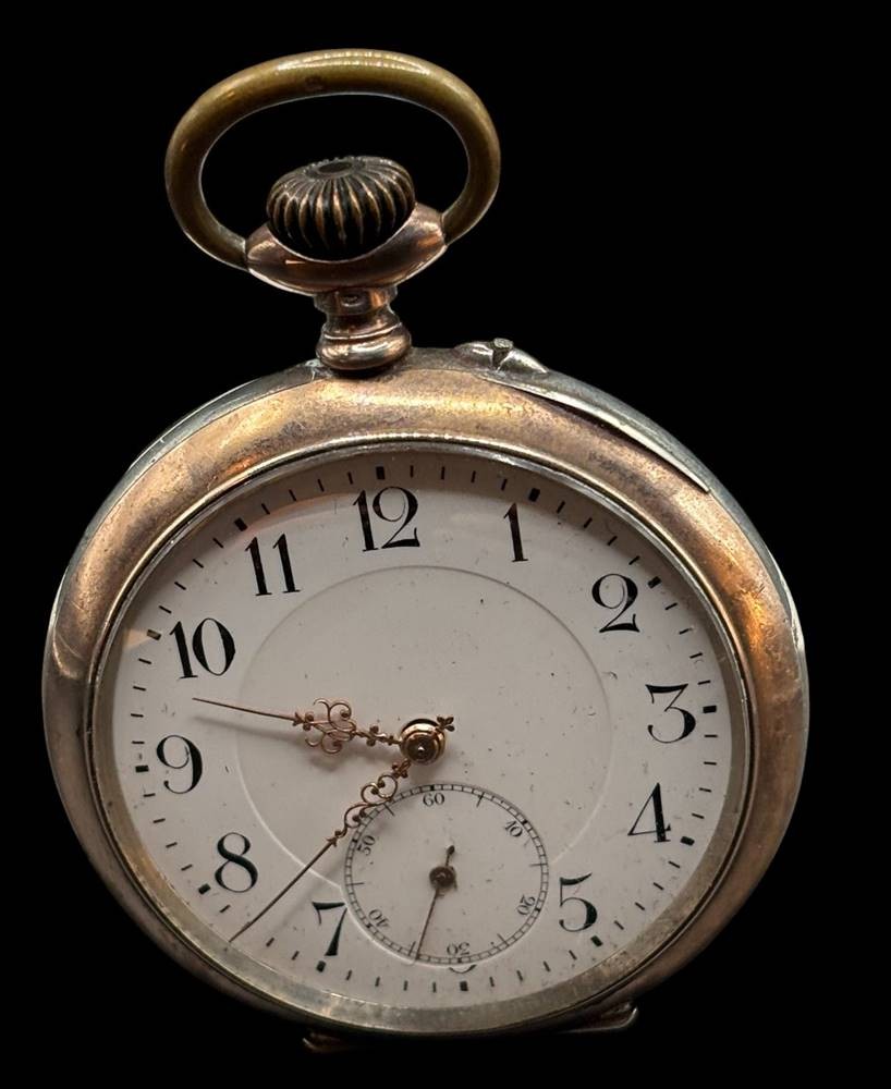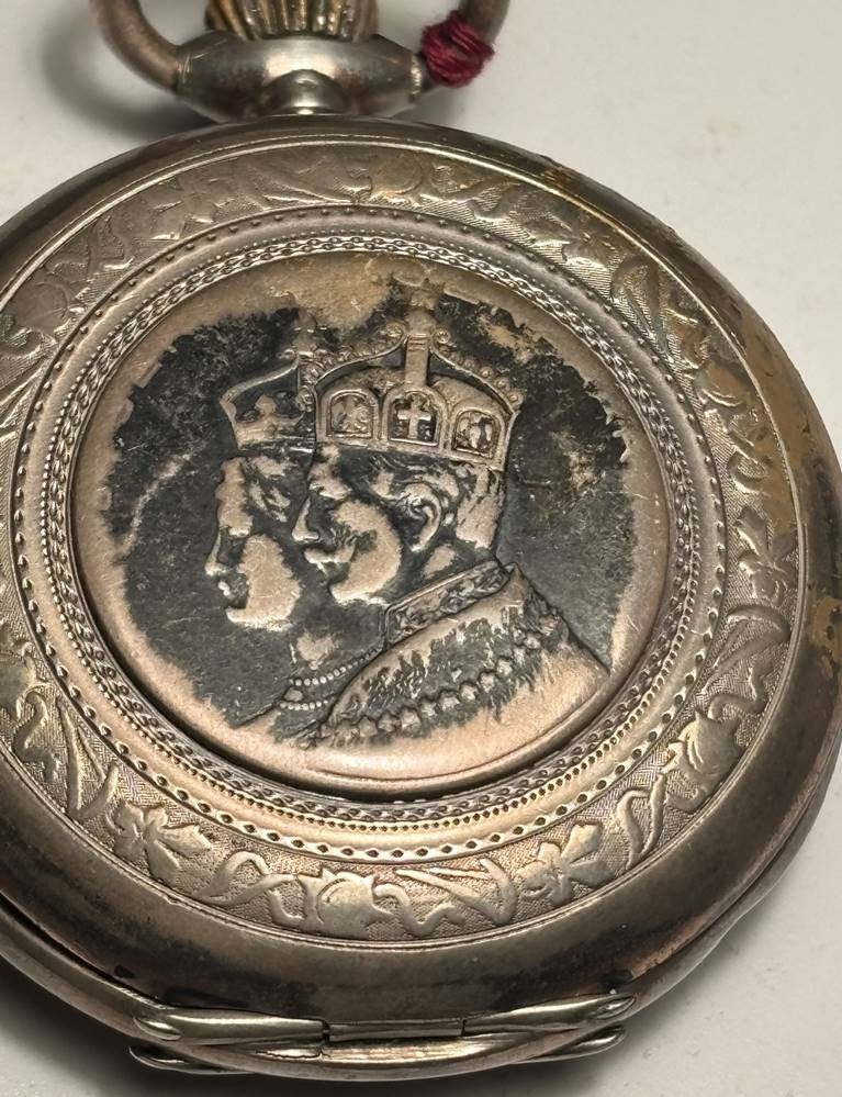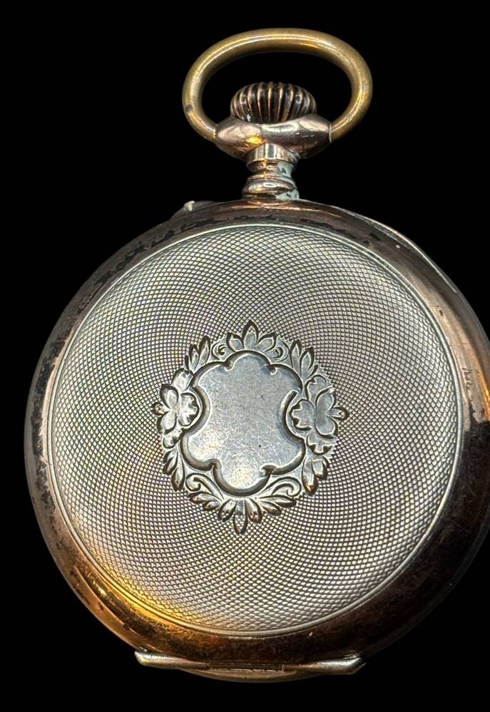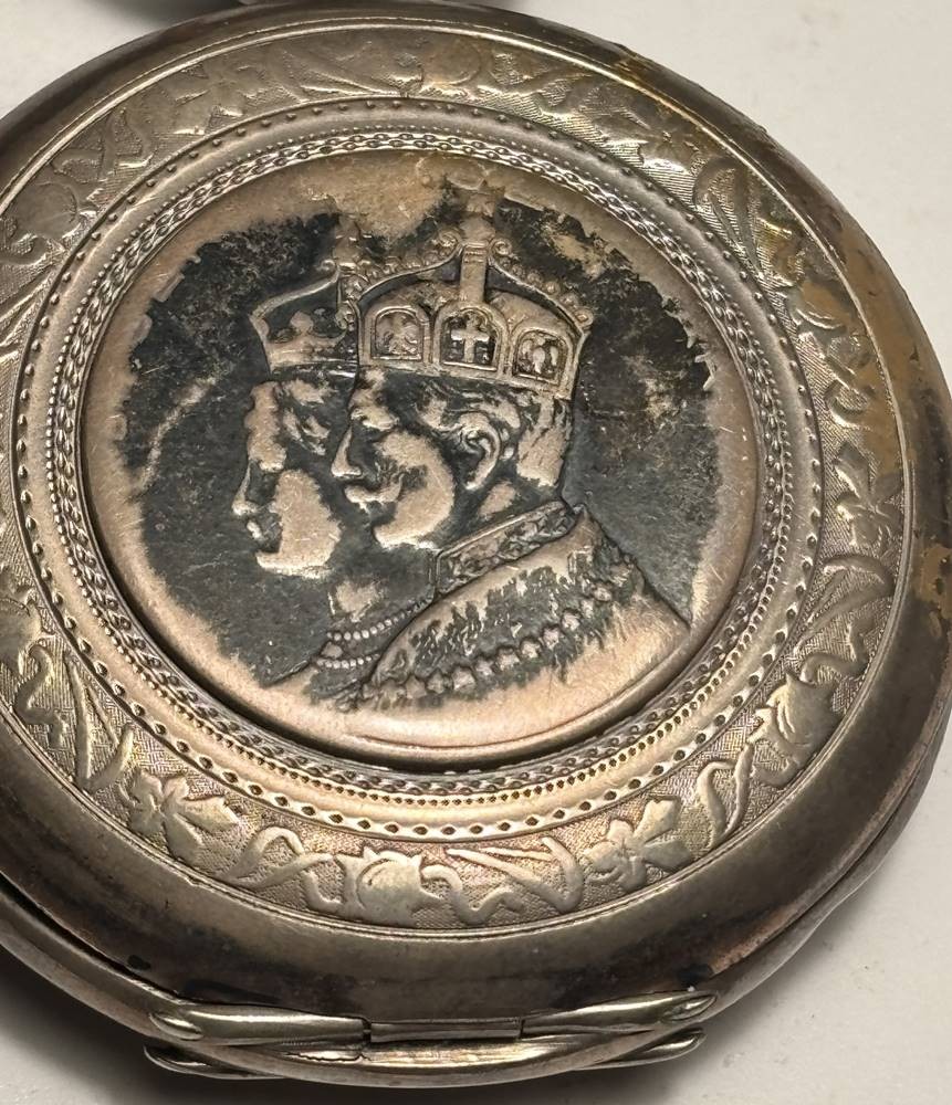 mechan. HTU, Savonette in Silbergehäuse-800-,3 Deckel Silber, mit Schweizer Eichhörnchen-Punze und deutschem Halbmonde/Krone Silbermarke, Deckel mit Kaiser Wilhelm II und Frau, 90 gr., D-5 cm [1]