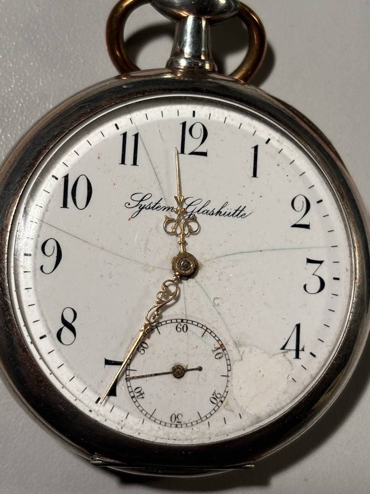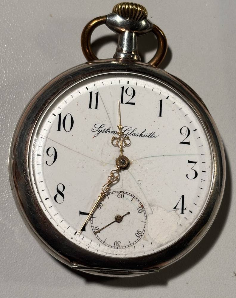 mechan. HTU "Systen Glashütte, Silbergehäuse mit 2 Silber-Deckel, Werk läuft, Ziffernblatt Haarrisse, D-5 cm [1]