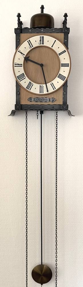 mechan. Wanduhr nach antiken Vorbild "Junghans" Schmiedeeisen, Werk läuft, Pendel/Gewichte anbei [1]