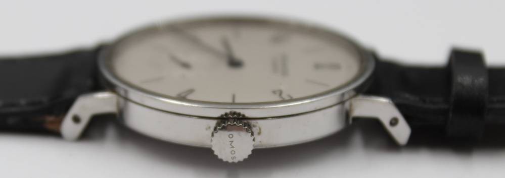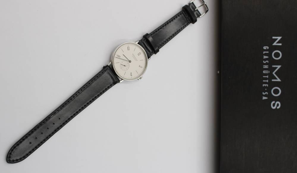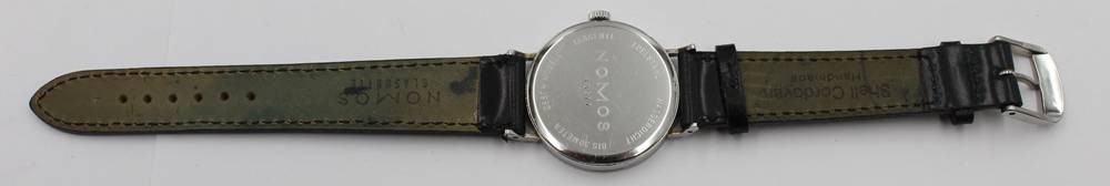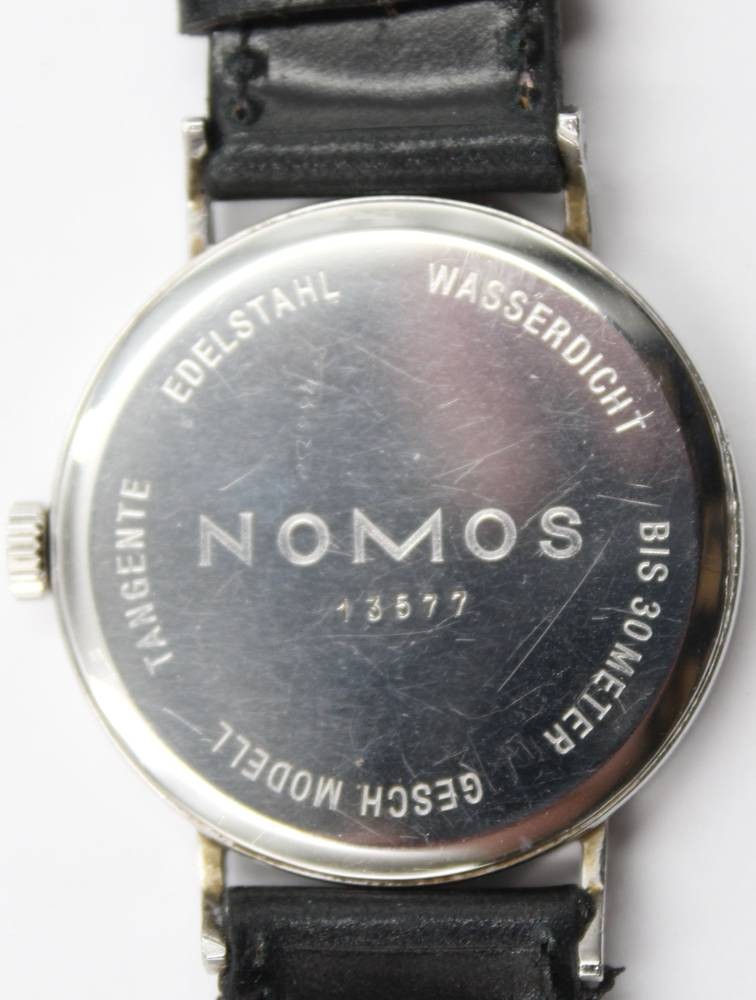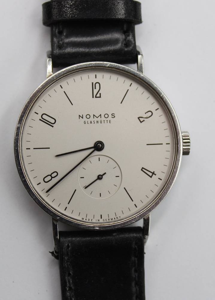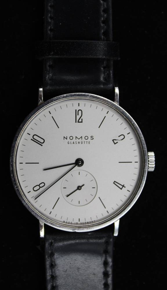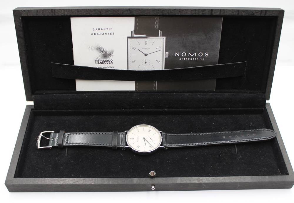 NOMOS Tangente Glashütte, Expo 2000, kl. Sekunde, mit Begleitheft, neues orignales Lederband, sehr gut erhalten, Handaufzug, Werk läuft, orig.Holzkasteb [1]