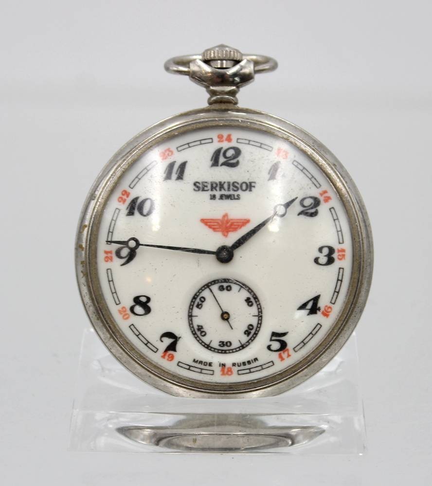 russische Herren-Taschenuhr, Serkisof, Kronenaufzug, Werk läuft, rückendekel mit Einesbahnrelief, ca. D-5cm [1]