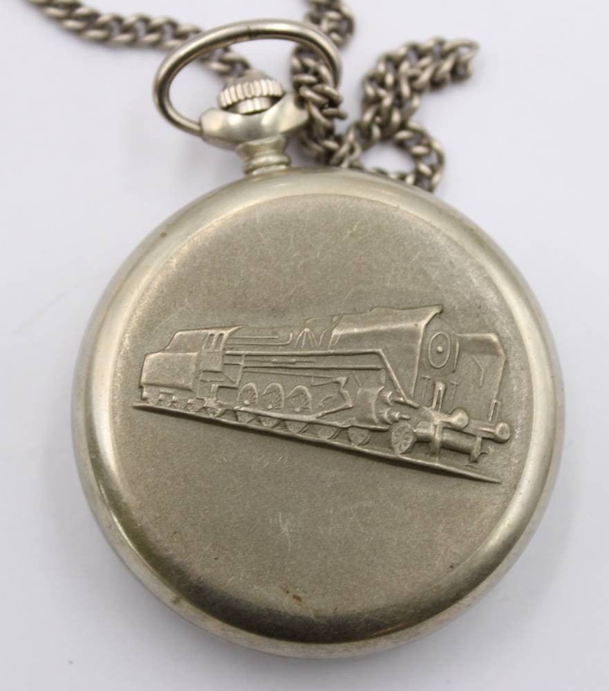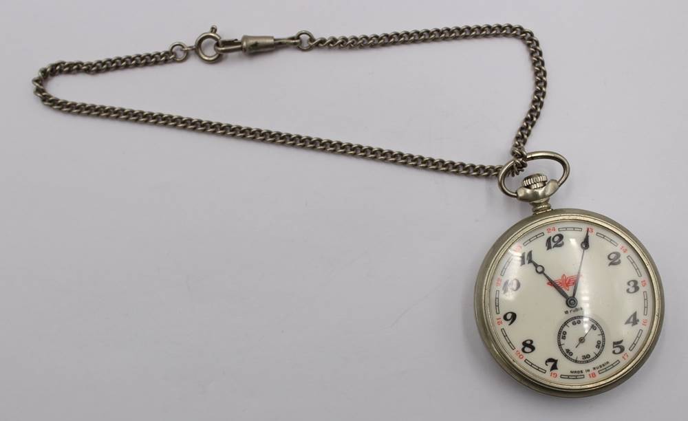 russische Taschenuhr, Marke Molnija, Werk läuft, verso Eisenbahnrelief, an Kette, ca. D-5cm [1]