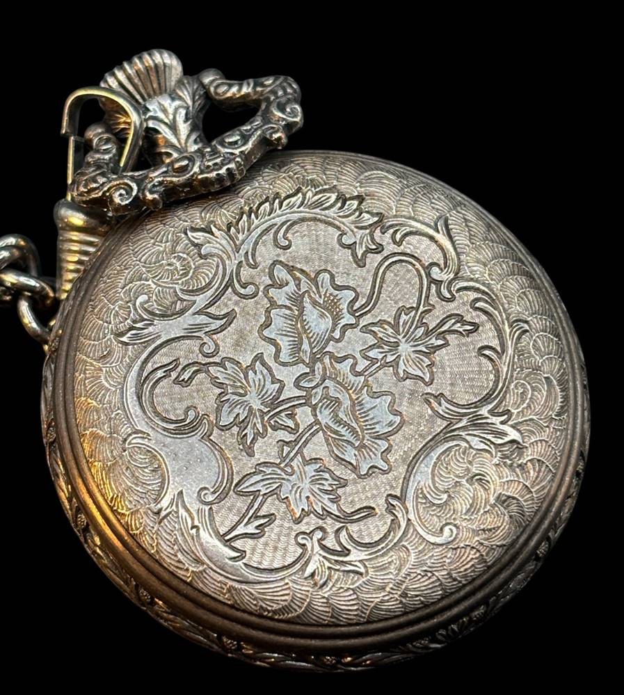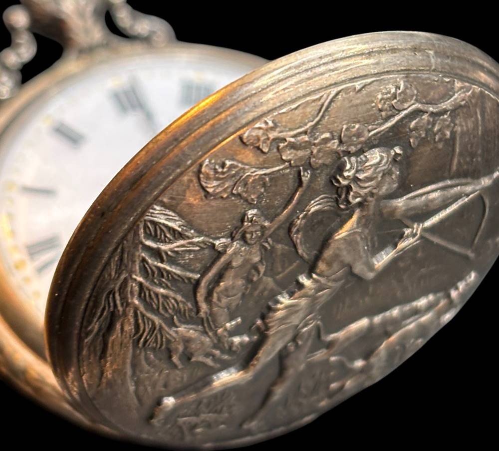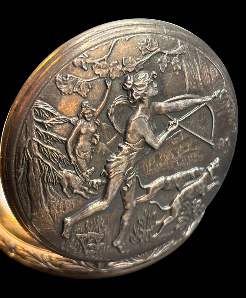 Savonette "Du Bois" Swiss, Werk läuft, Uhrenkette, Sprungdeckel mit Diana bei der Jagd [1]