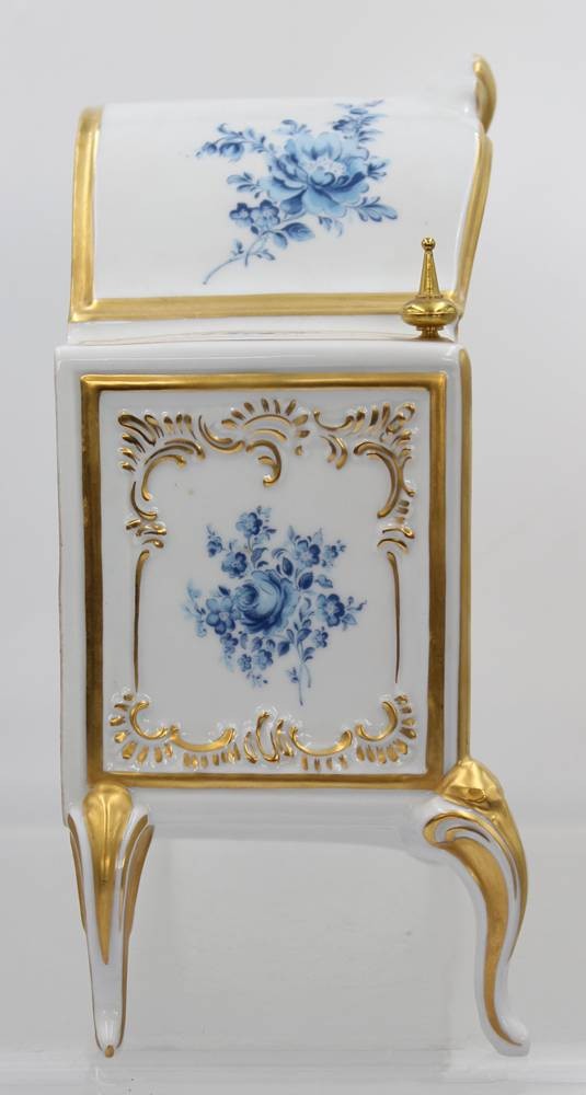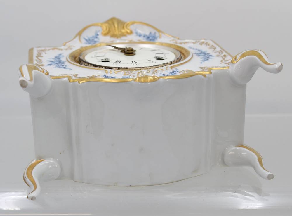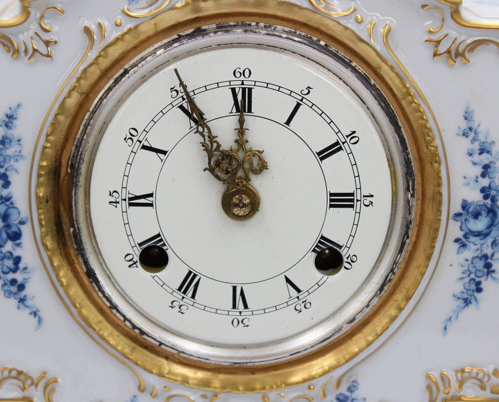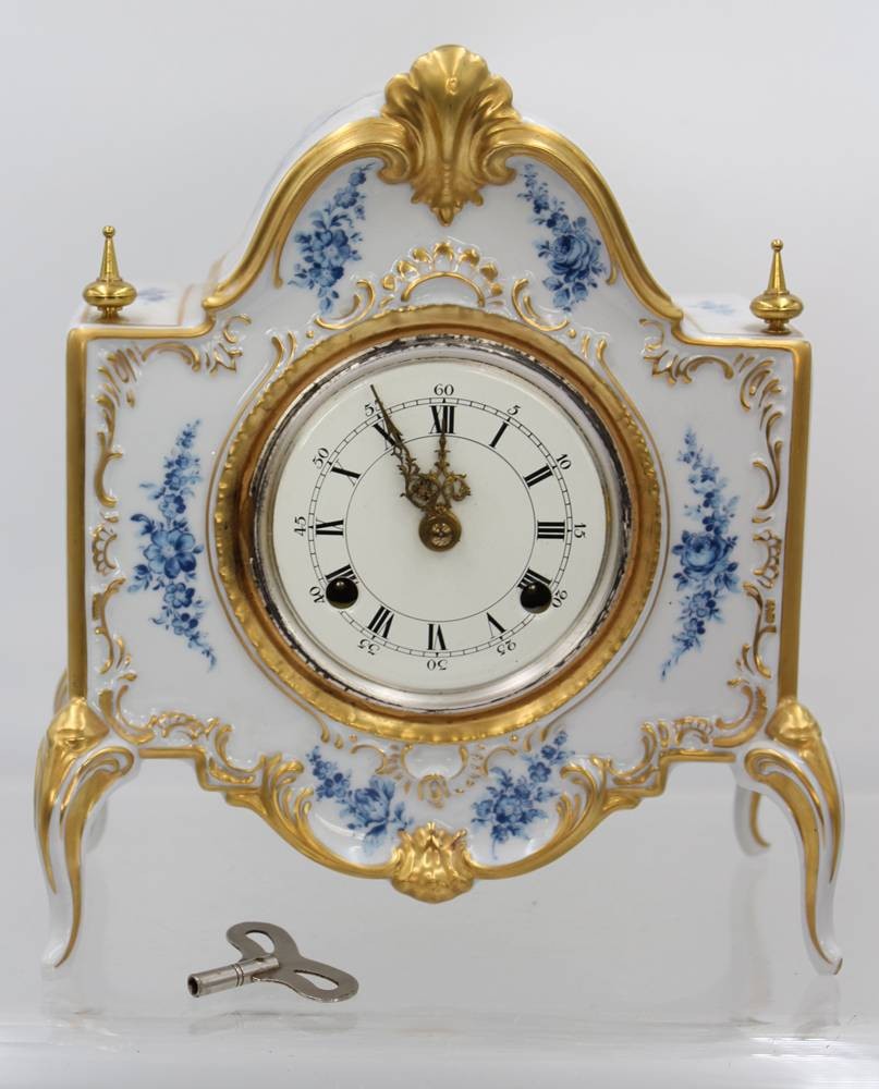 schöne Porzellan-Tischuhr, Dresden, Alt Meissen, blaue floral Bemalung, Schlüsselwerk, Werk läuft an (ca.10sec.), ca. H-24cm B-21cm T-11cm [1]
