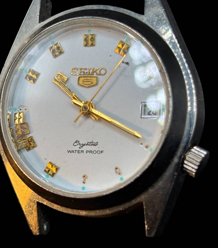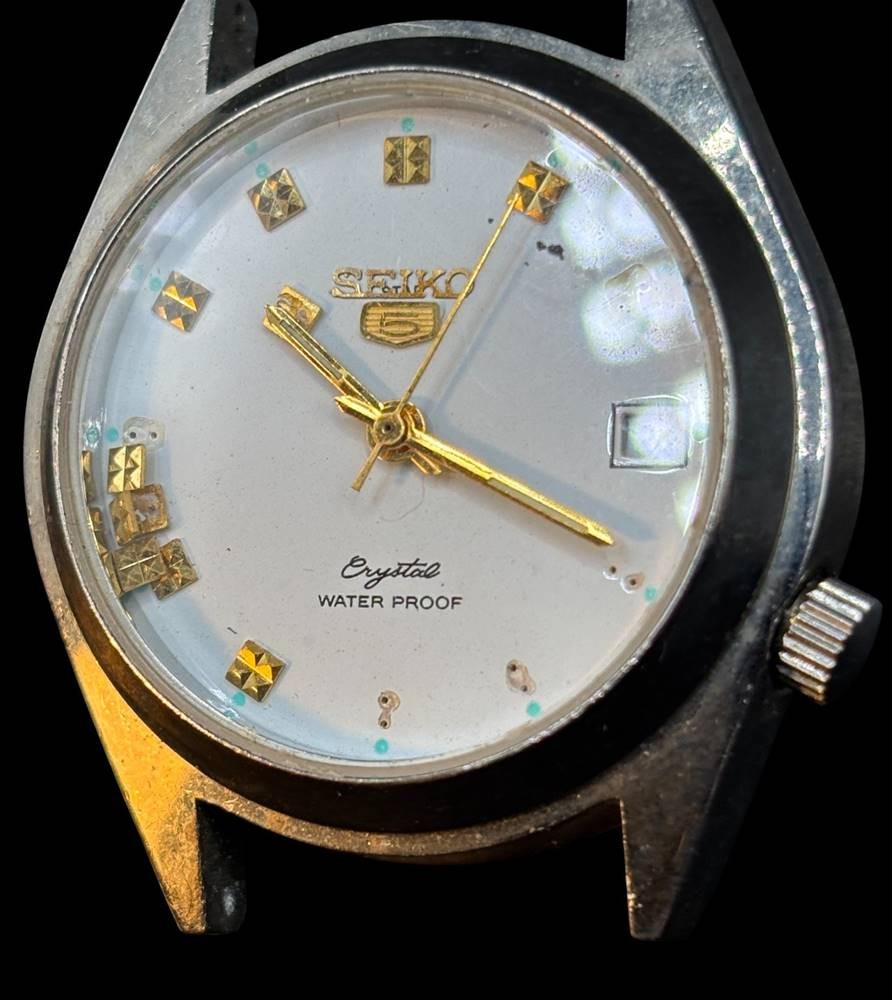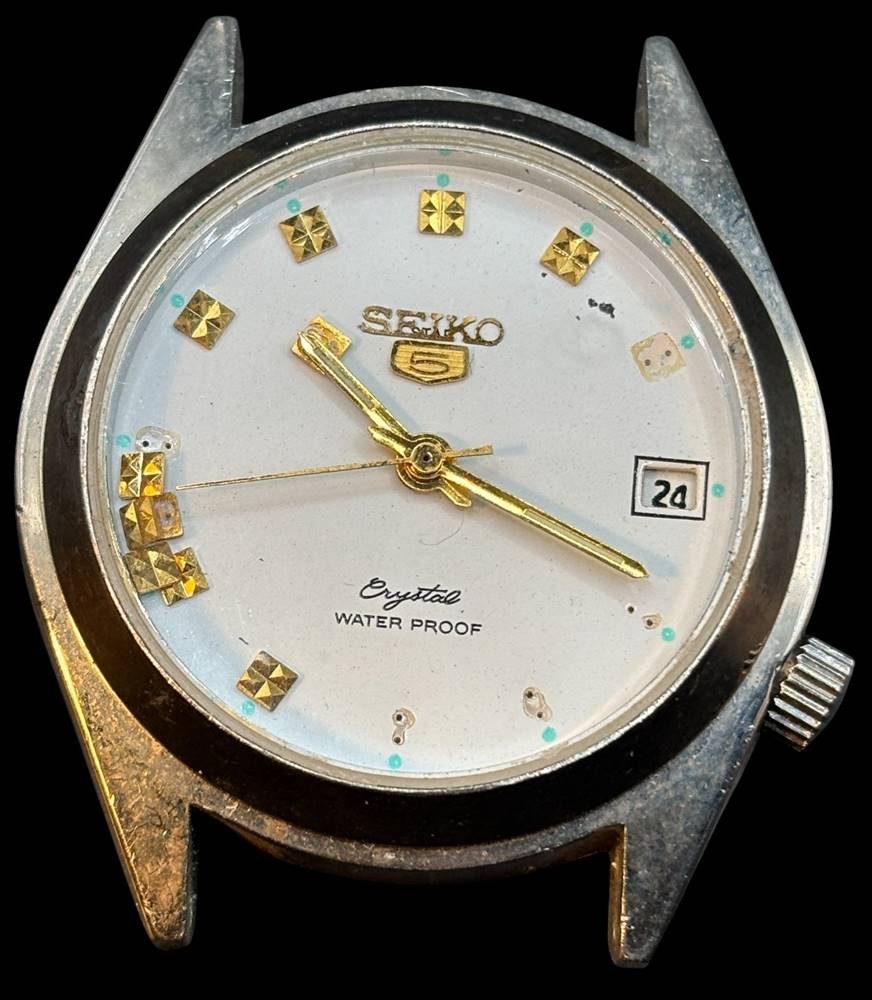 SEIKO 5 Crystal mechan. HAU ohne Band, Werk läuft, einige Stunden-Anzeige Plättchen lose, D-ca. 4 cm [1]