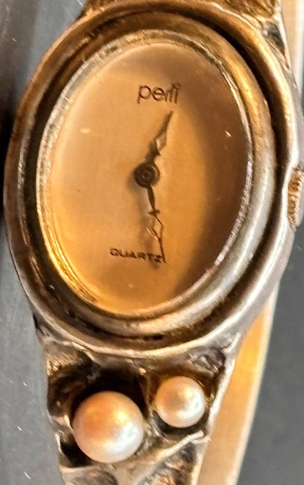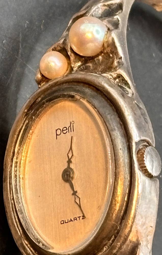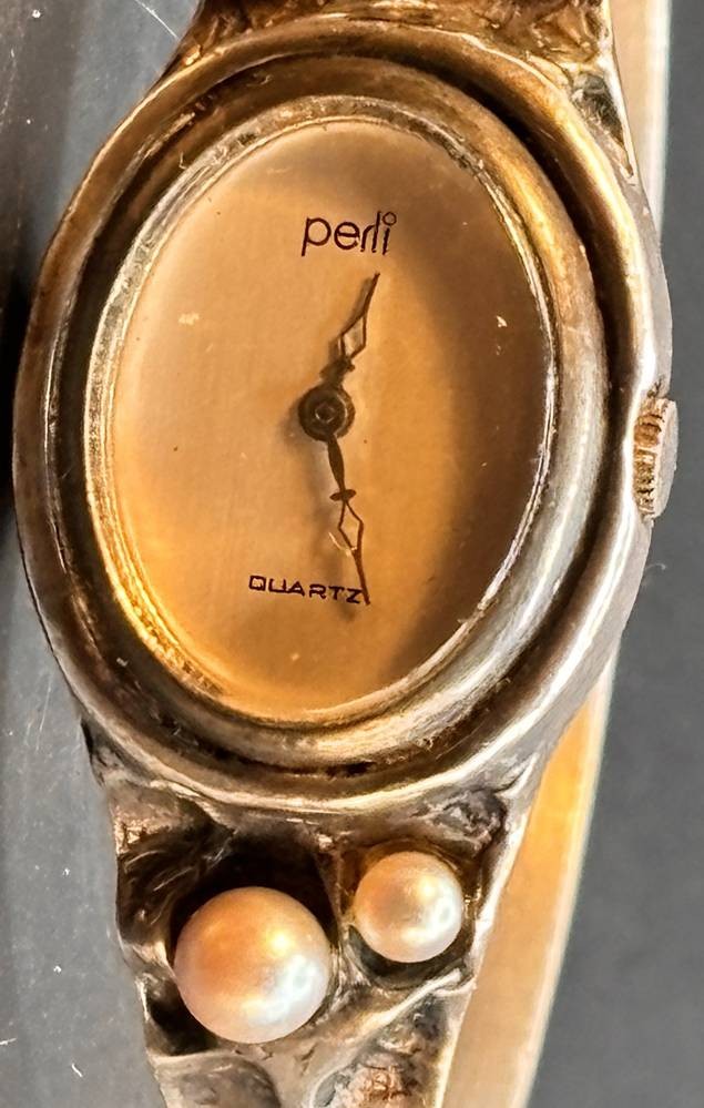 Silber-835- Spangenuhr "Perli" Quartz, mit Perlchen, Werk nicht überprüft, zus. 38,2 gr., ungepflegt, Klappscharnier mit doppelter Sicherheitsacht [1]