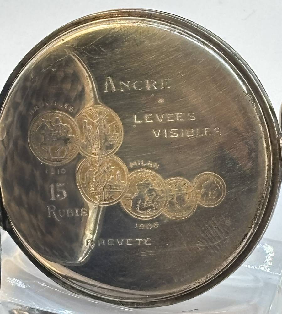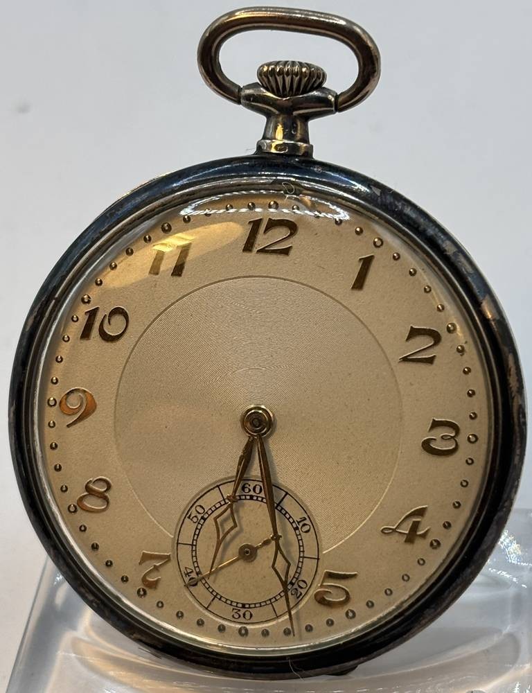 Silber-Taschenuhr um 1915, Schweizer Werk mit seltenen in Tula gefertigten Deckel mit Gold/Silber revidiert."Fussballer" 15 Rubis, gut erhalten, Werk läuft, D-4,5 cm, ungeputzt (wohl von Elgin, anlässlich Olympiade 1912 in Stockholm?)