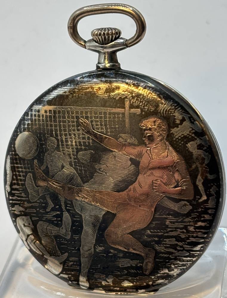 Silber-Taschenuhr um 1915, Schweizer Werk mit seltenen in Tula gefertigten Deckel mit Gold/Silber revidiert."Fussballer" 15 Rubis, gut erhalten, Werk läuft, D-4,5 cm, ungeputzt (wohl von Elgin, anlässlich Olympiade 1912 in Stockholm?) [1]