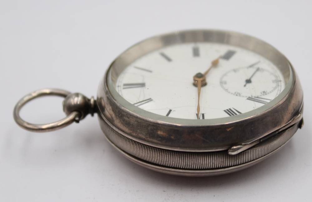 Spindeltaschenuhr, Waltham, Silbergehäuse, Werk läuft, Ziffernblatt altrissig, D-5,3cm