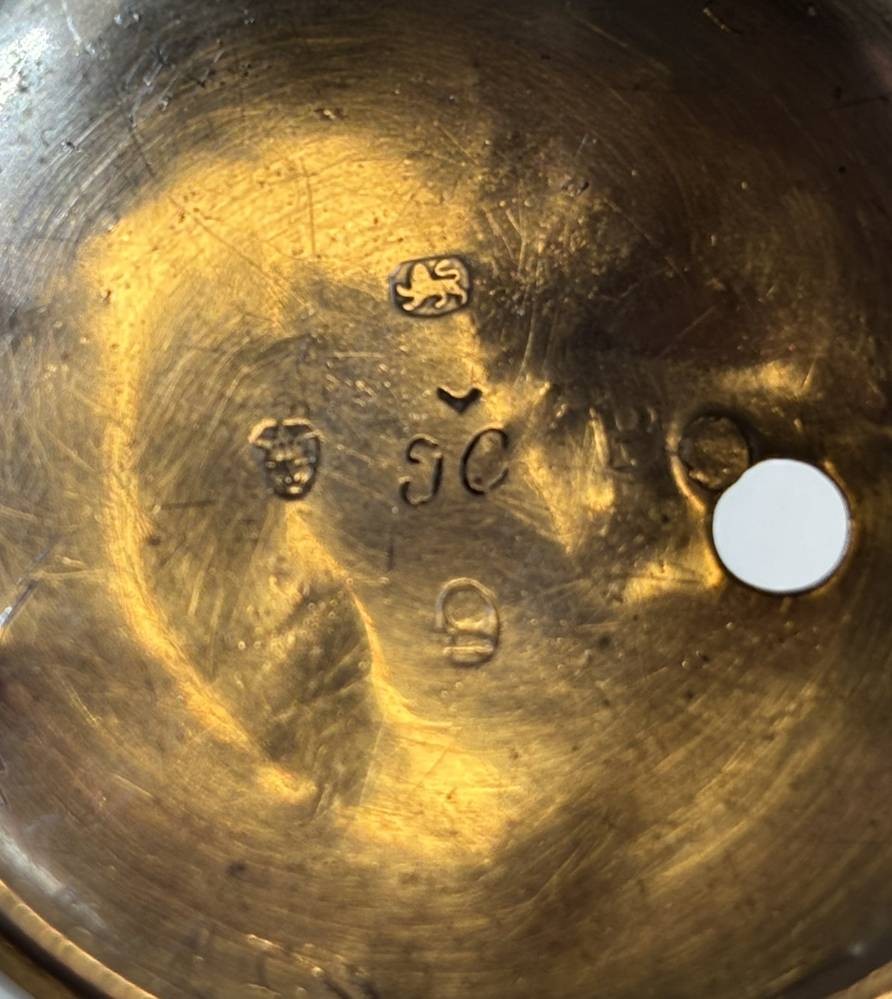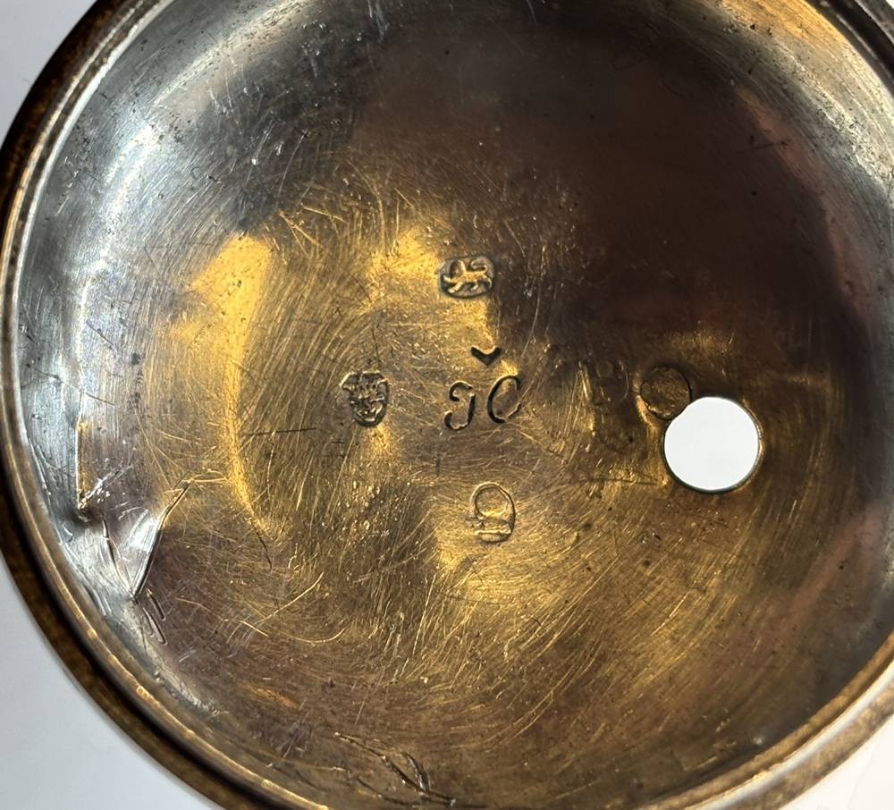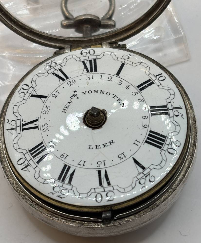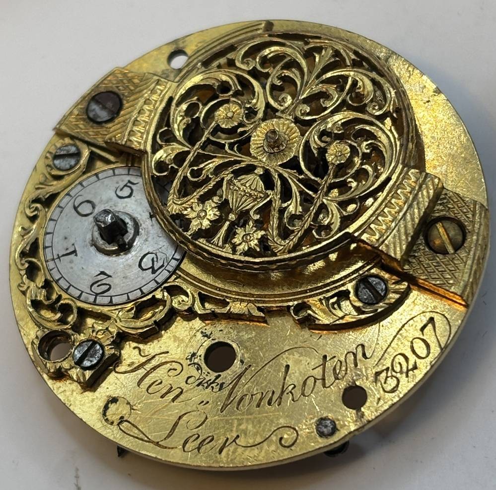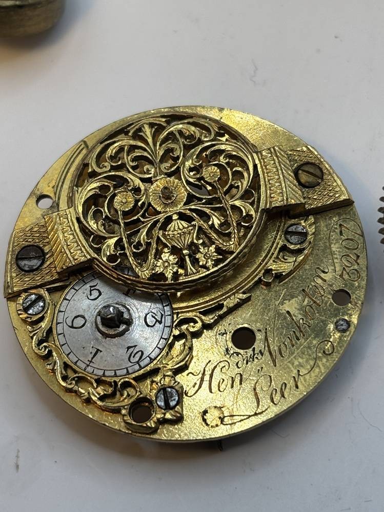 Spindeluhr Silbergehäuse aus Leer, einige Uhrenteile anbei, Ziffernblatt beschriftet "Hendrik Vonkoten, Leer", D-ca. 4 cm, Uhrwerkplatte ebenfalls beschriftet [1]