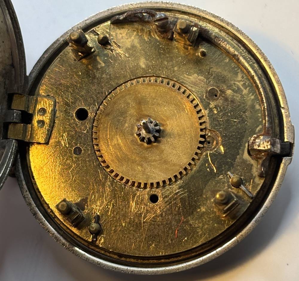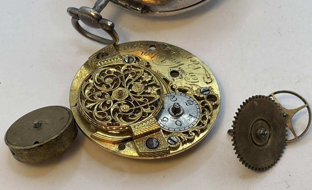 Spindeluhr Silbergehäuse aus Leer, einige Uhrenteile anbei, Ziffernblatt beschriftet "Hendrik Vonkoten, Leer", D-ca. 4 cm, Uhrwerkplatte ebenfalls beschriftet