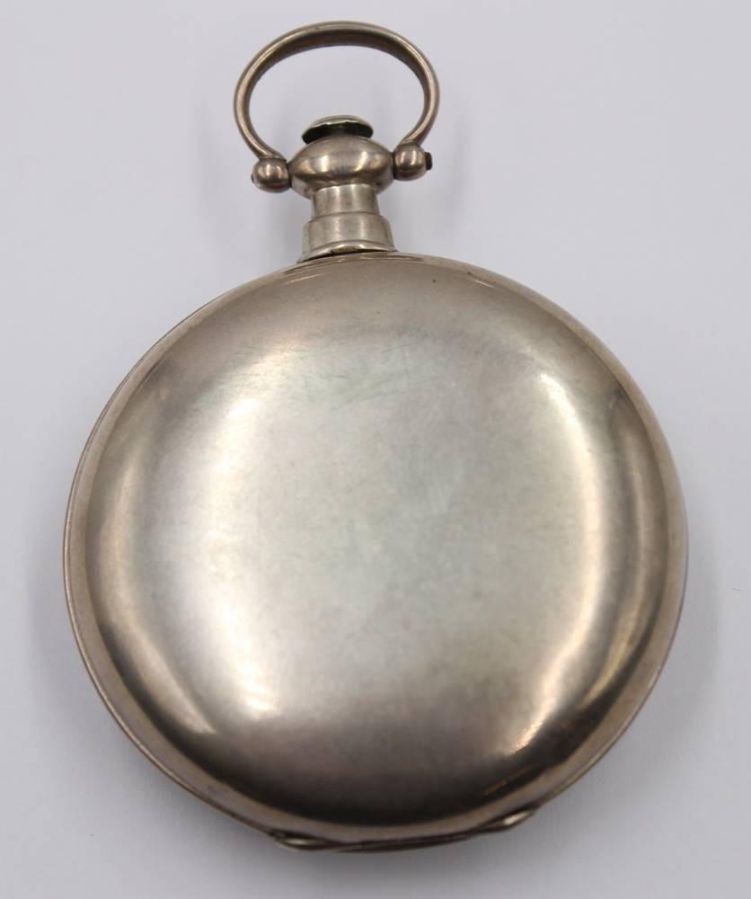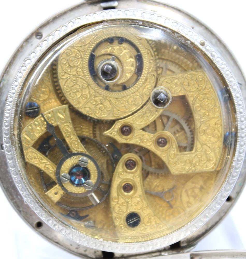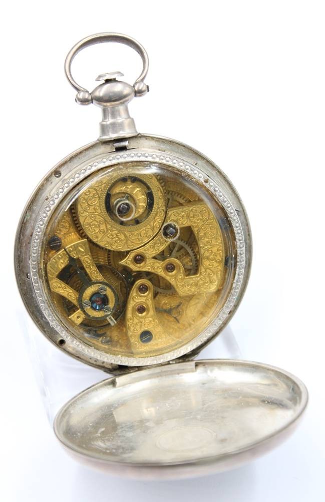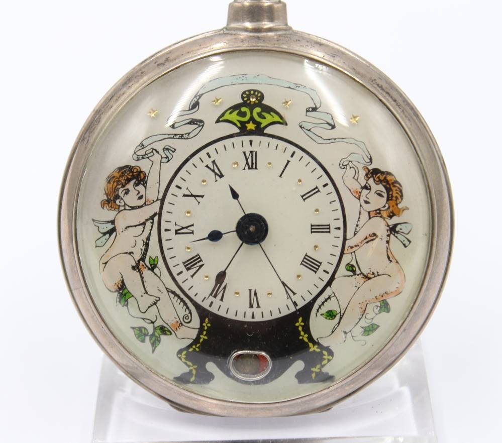 Taschenuhr für chinesischen Markt, Schweiz um 1880, Silbergehäuse, Zifferbl. m. röm. Zahlen, Scheinpendel, Schlüsselwerk läuft, D-5cm [1]