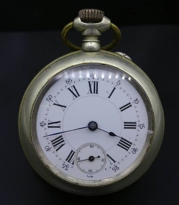 Taschenuhr Markenlos mit Emailliertem Zifferblatt und Metallgehäuse , Glasboden Ø 50mm Uhr läuft nicht [1]