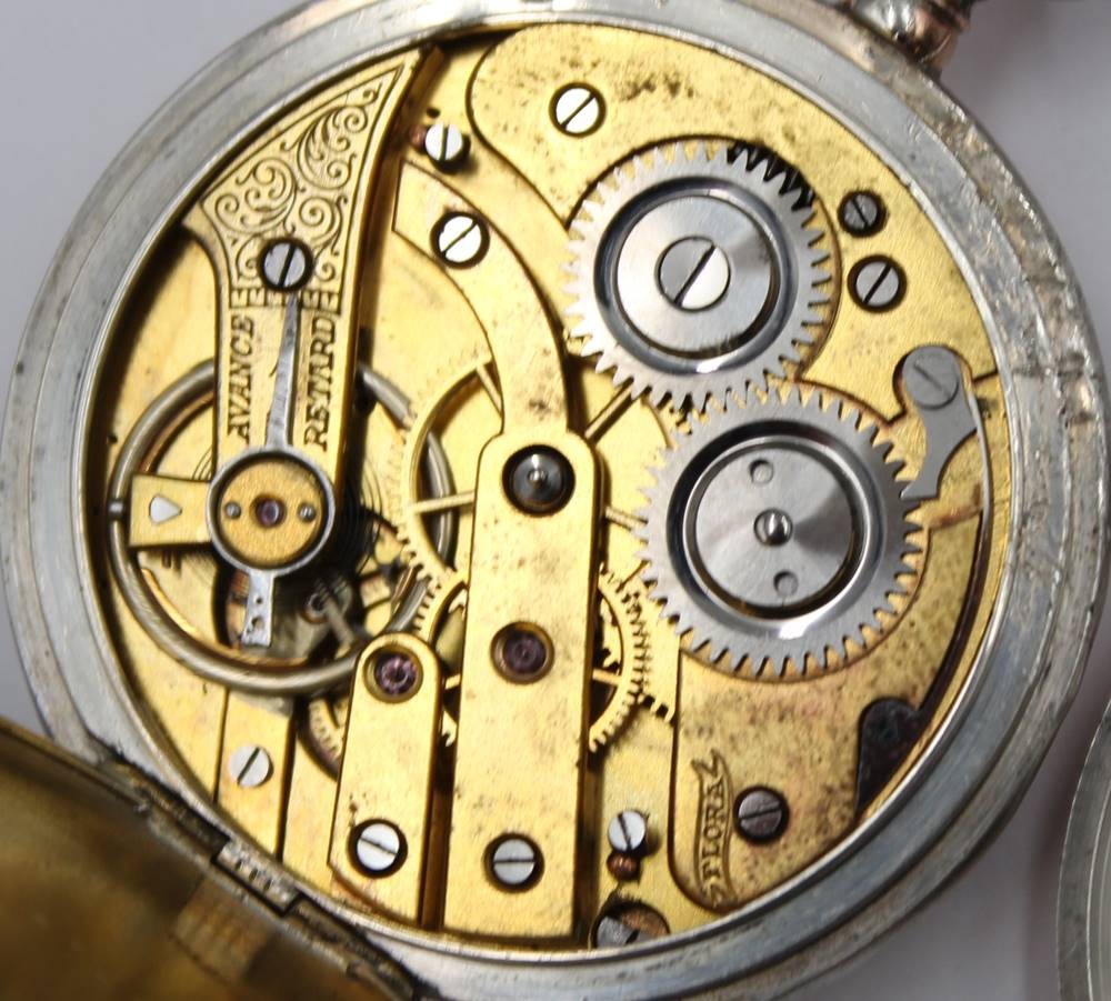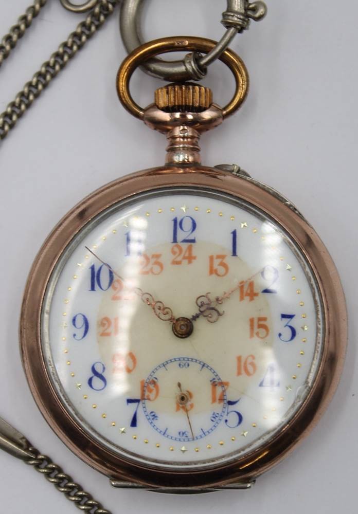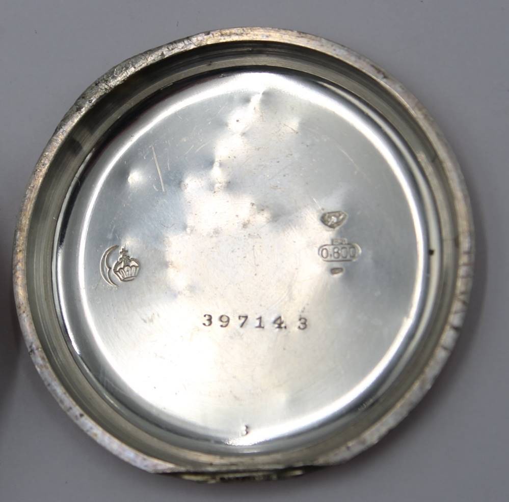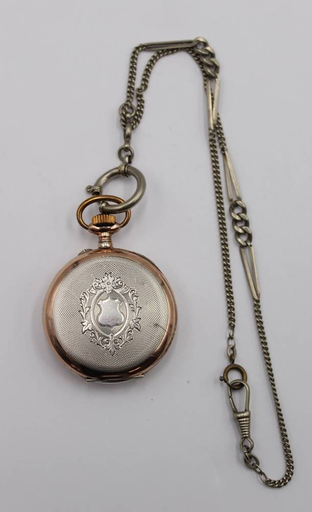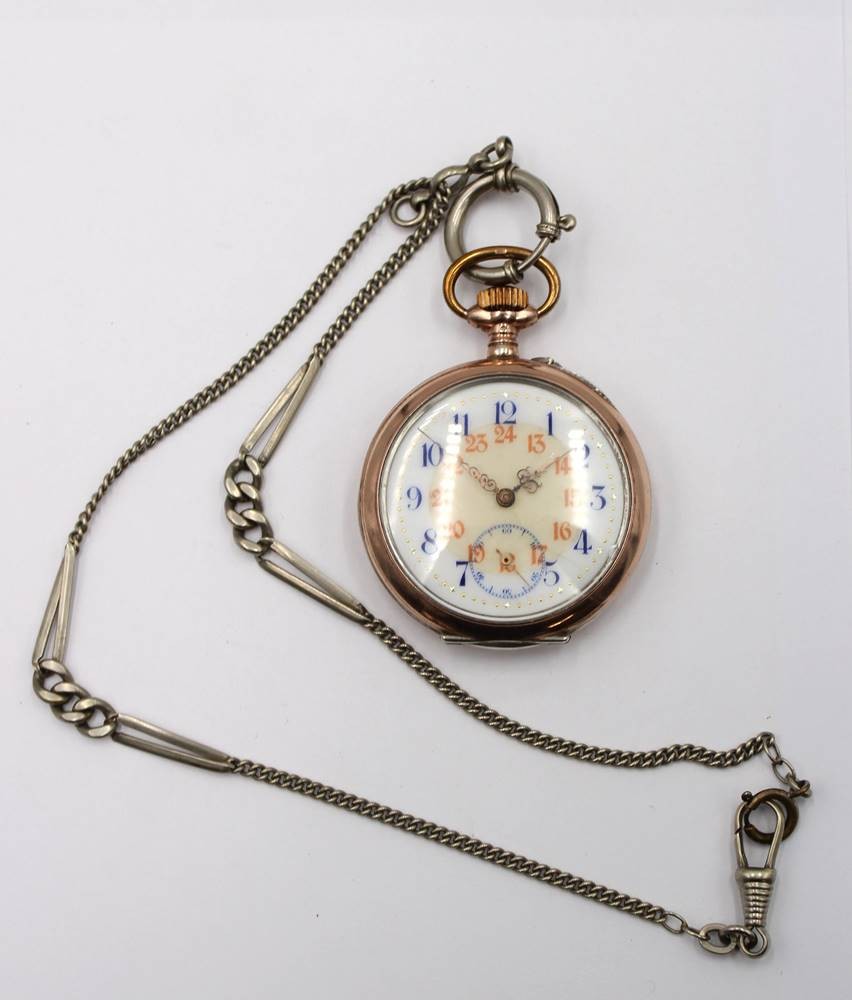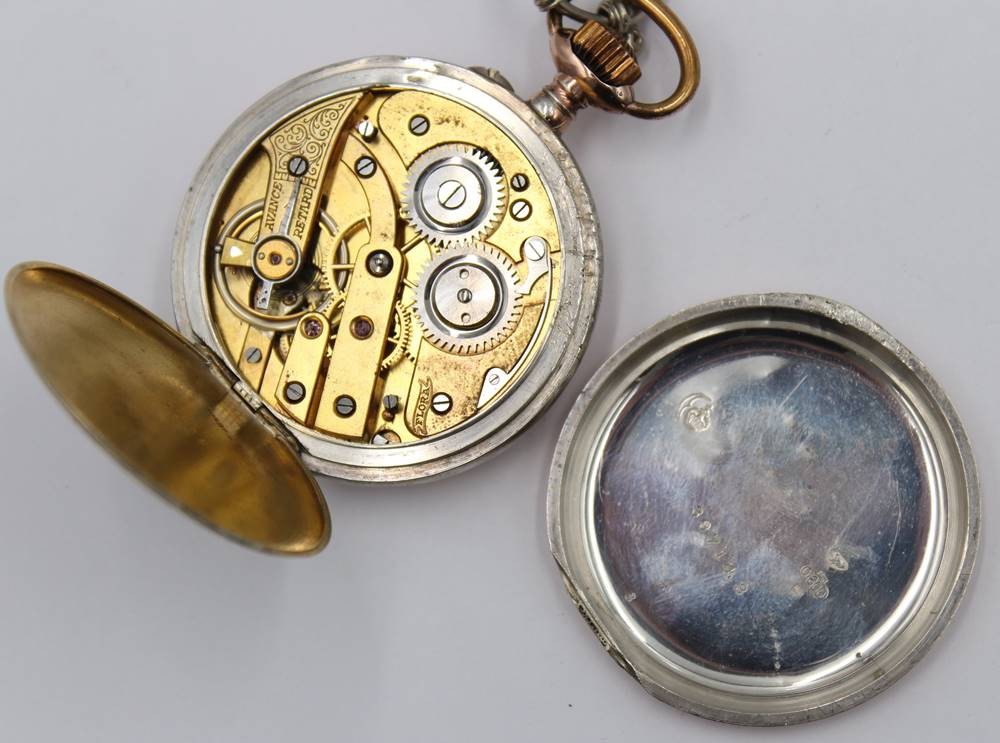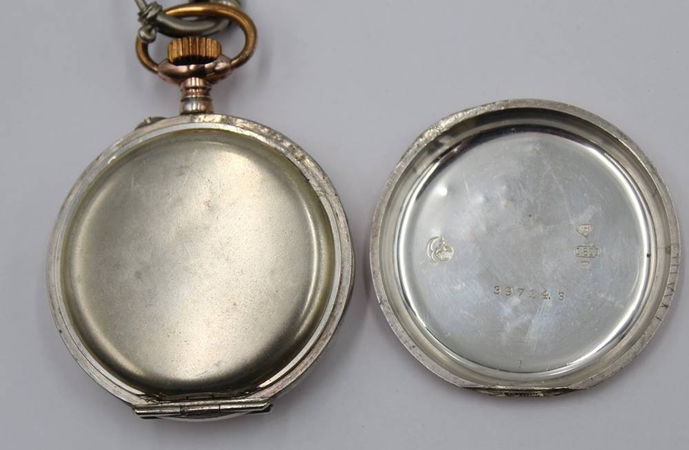 Taschenuhr um 1920, Silbergehäuse, Kronenaufzug, Werk läuft, Rückendeckel lose, an Kette, ca. H-4,8cm [1]