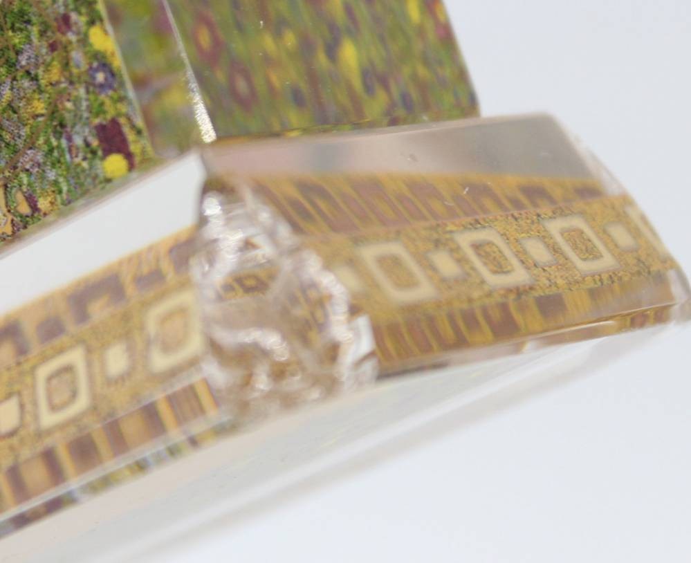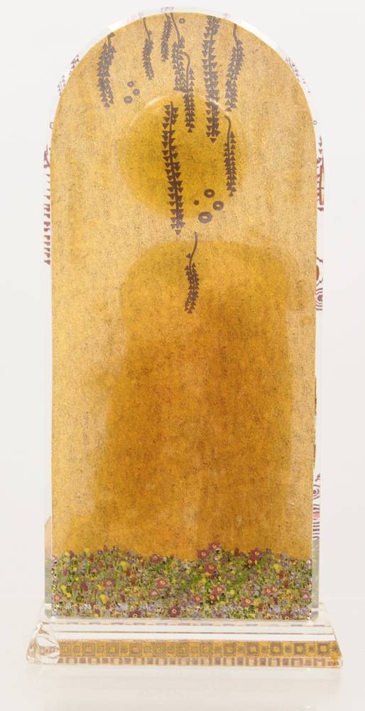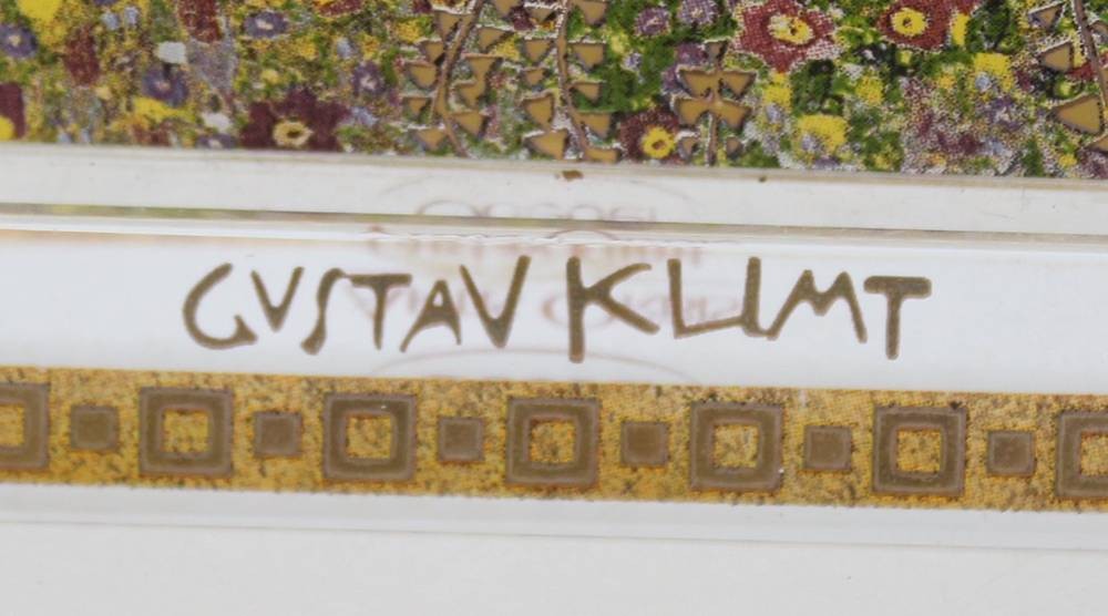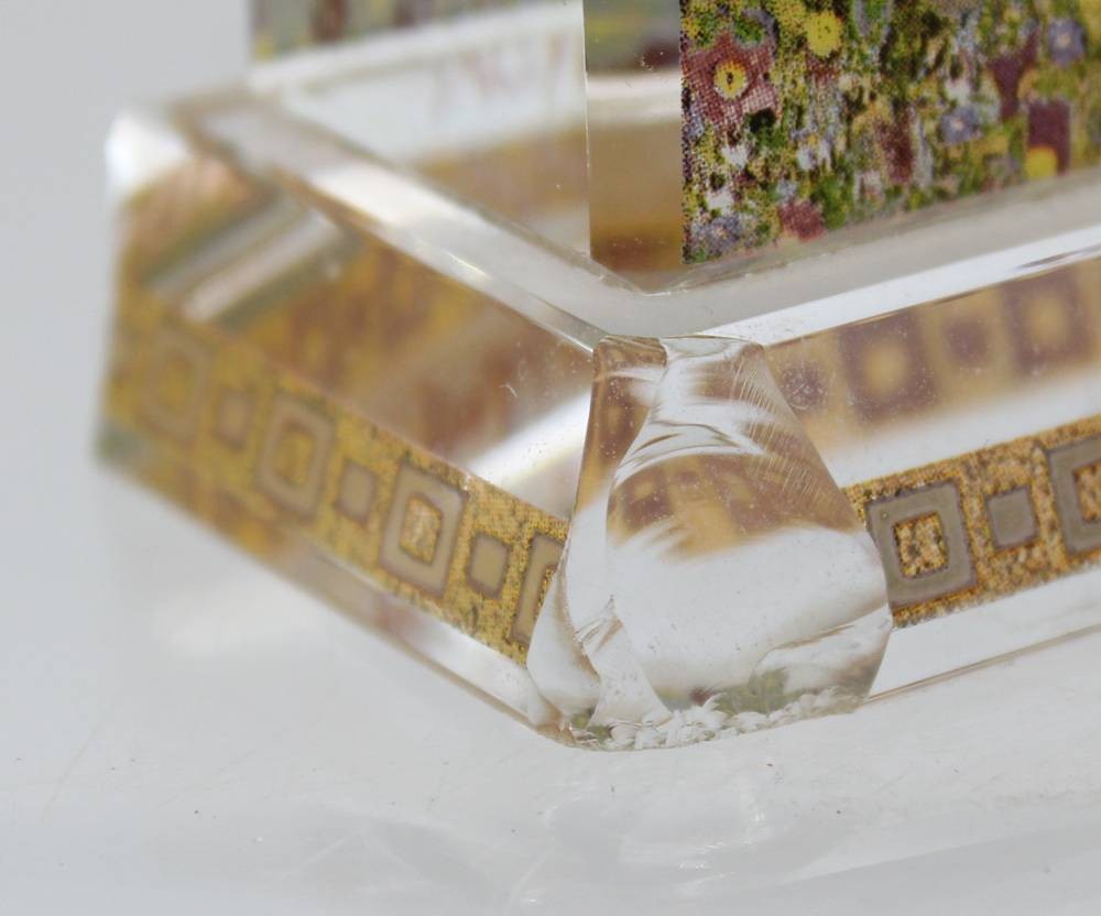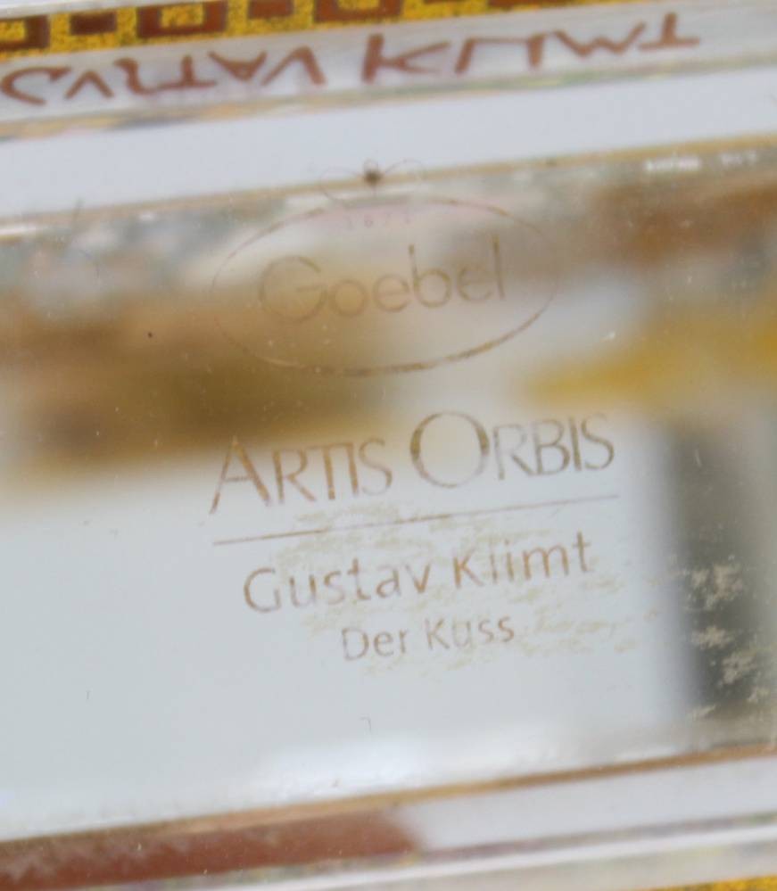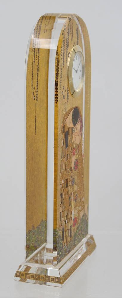 Tischuhr, Glas, „Der Kuss“ von Gustav Klimt, Quarzuhrwerk nicht geprüft, Gehäuse am Stand 2x Bestossen, ca. H-22cm B-10,5cm [1]
