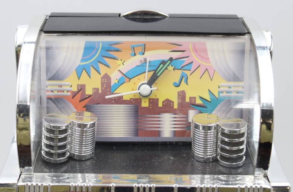 Tischuhr in Form einer Jukebox, Meister Anker, Batteriewerk, Weckfunktion scheint defekt, H-19cm B-15cm T-10cm [1]