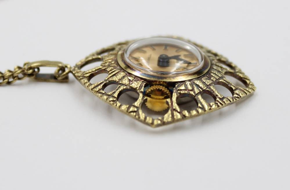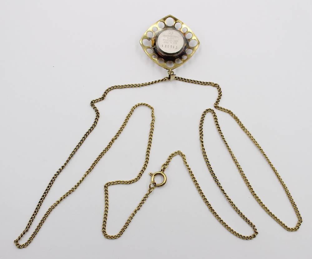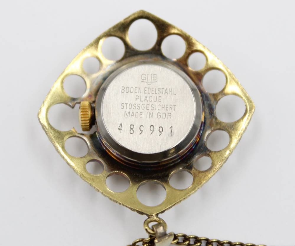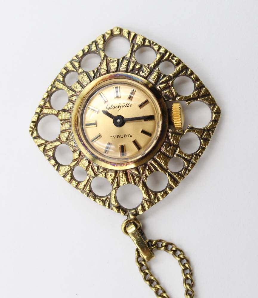 Vintage-Damen-Umhängeuhr, Glashütte, Handaufzug, Werk läuft, an Kette, ca. L-76cm, Uhr L-3,5cm [1]