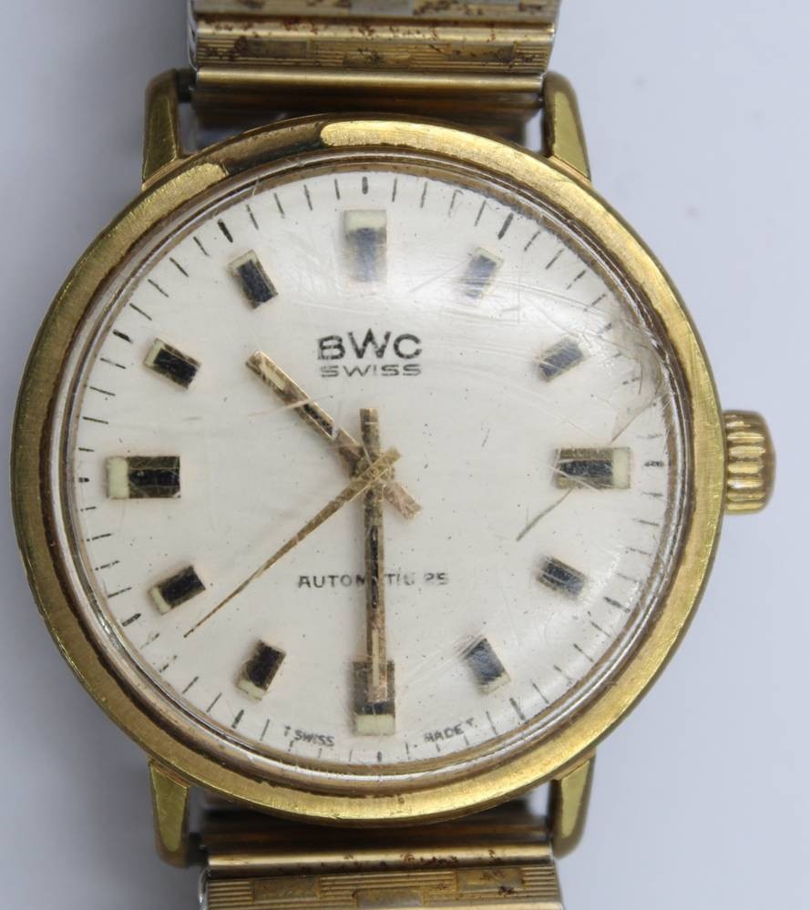 Vintage-Herren-Armbanduhr, BWC Automatic, Werk läuft, starke Tragespuren, Zugband, D-3,6cm [1]