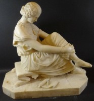 sitzende Sappho, Alabaster Bildhauerarbeit um 1870, H-44 cm, 44x23 cm, 24 kg, Ellbeuge mit feinen Spannungsriss?, ansonsten gut erhalten