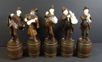5 Strassenmusiker auf Holzfass, Holz/Bein??, wohl 19.Jhd., H--21 cm, Dirigentenstab und Geigenbogen fehlen,