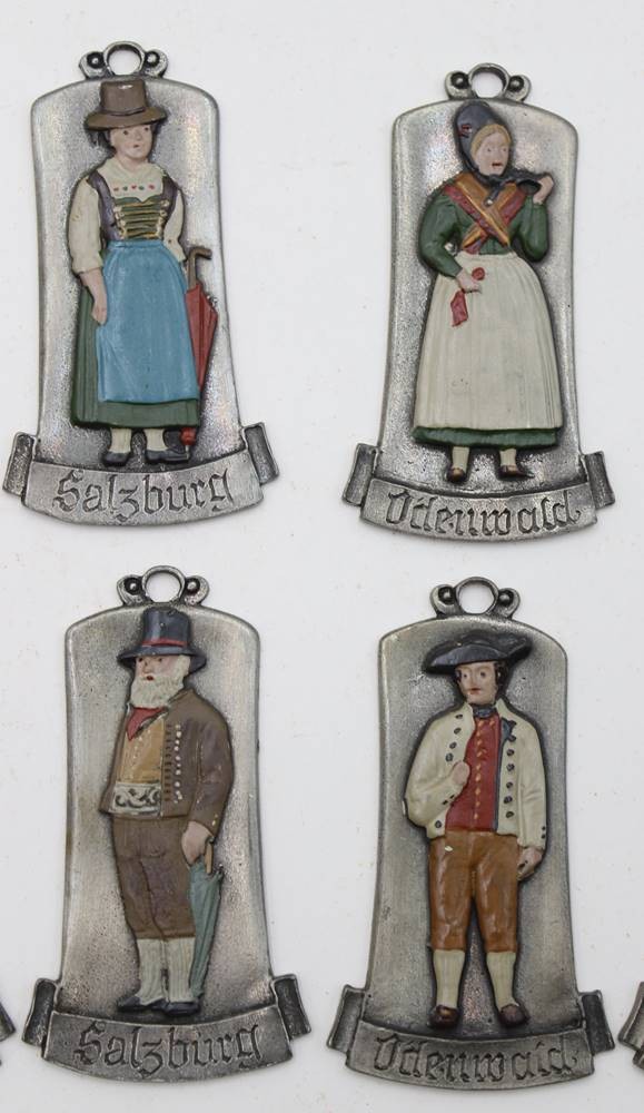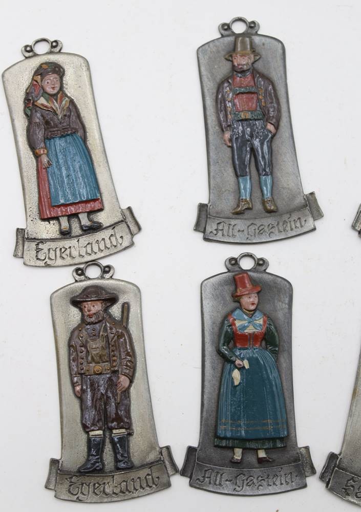 12x Trachtenplaketten aus Zinn, farbig gefasst, Kühn Zinn, je ca. L-8cm [1]