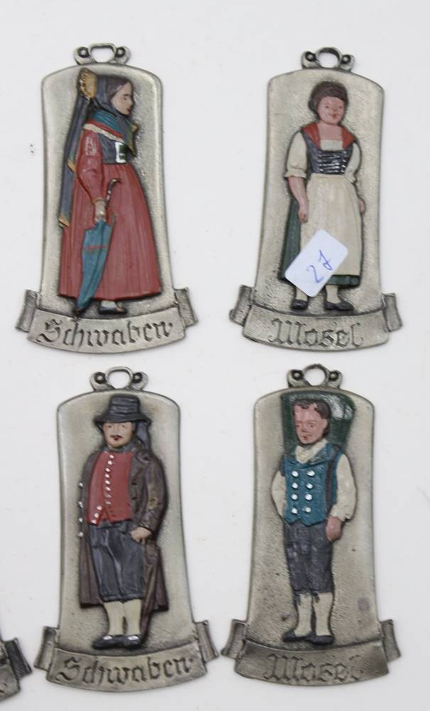 12x Trachtenplaketten aus Zinn, farbig gefasst, Kühn Zinn, je ca. L-8cm