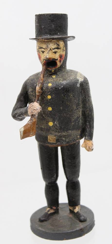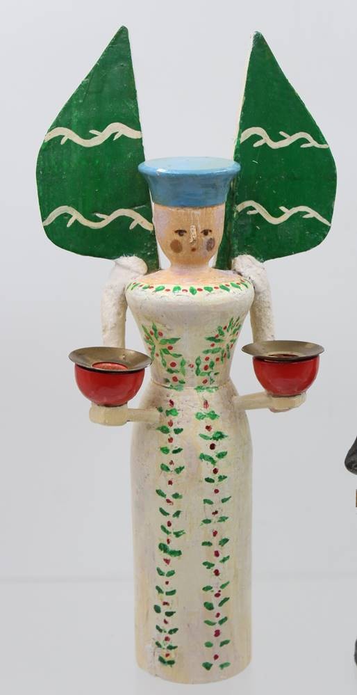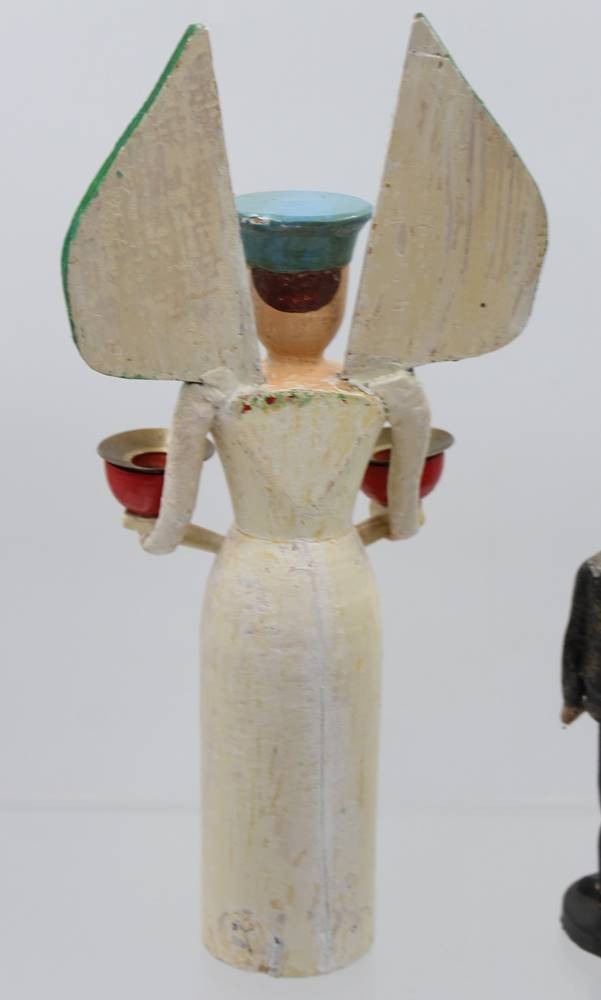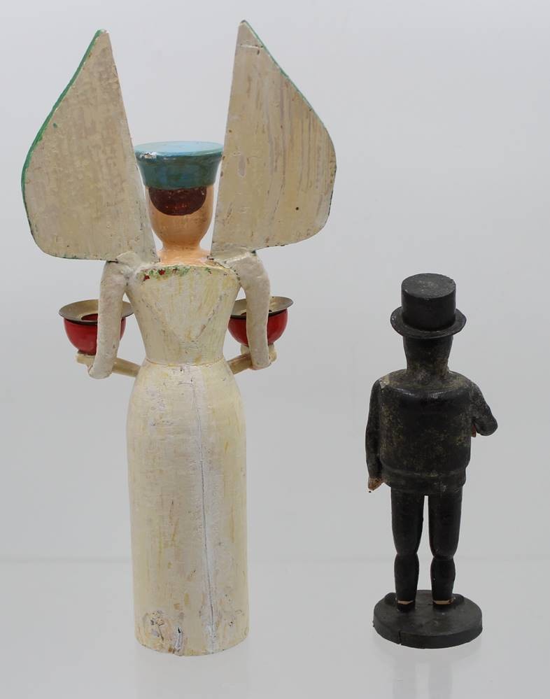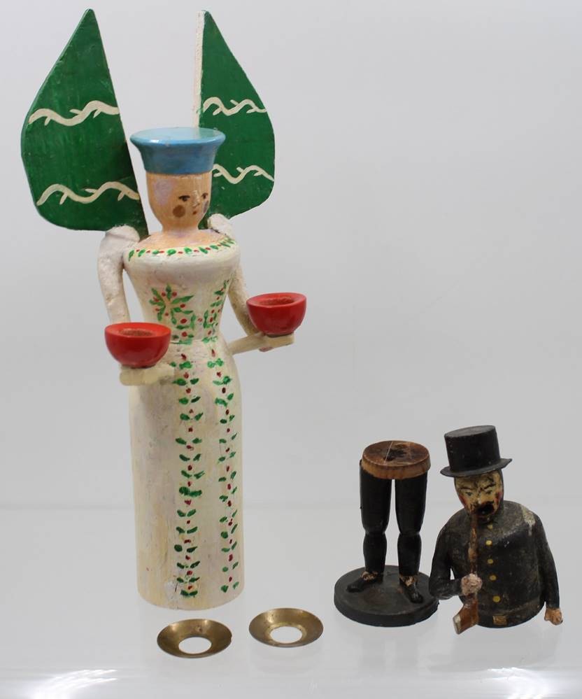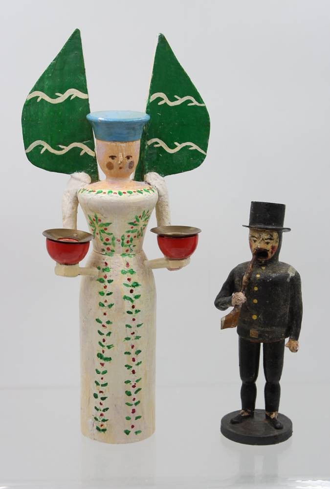 2 Teile Erzgebirge, gr. Engel und antiker Räuchermann dieser wohl Werkstatt Füchtner Seiffen, um 1930, ca. H-30cm und H-18cm, je mit Altersspuren, Engel mit Klebestelle [1]