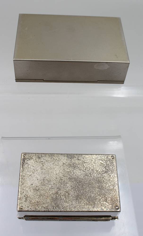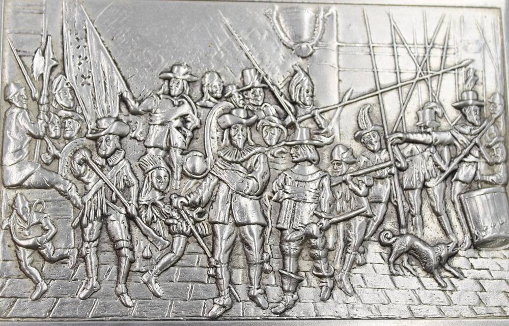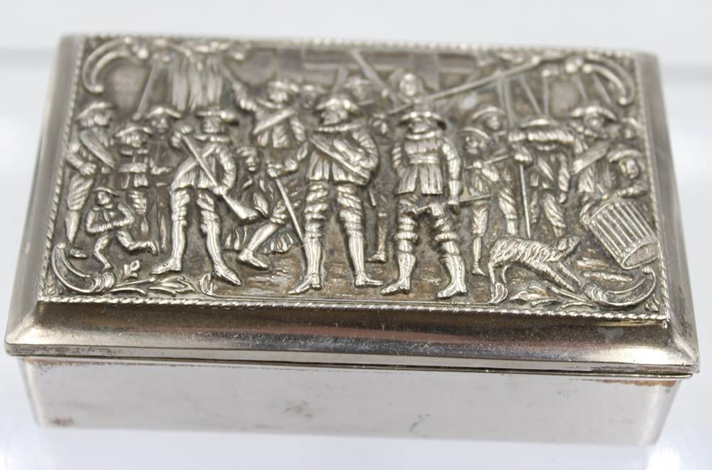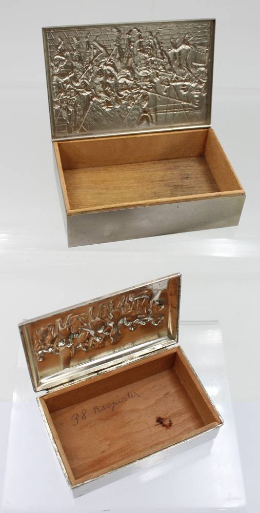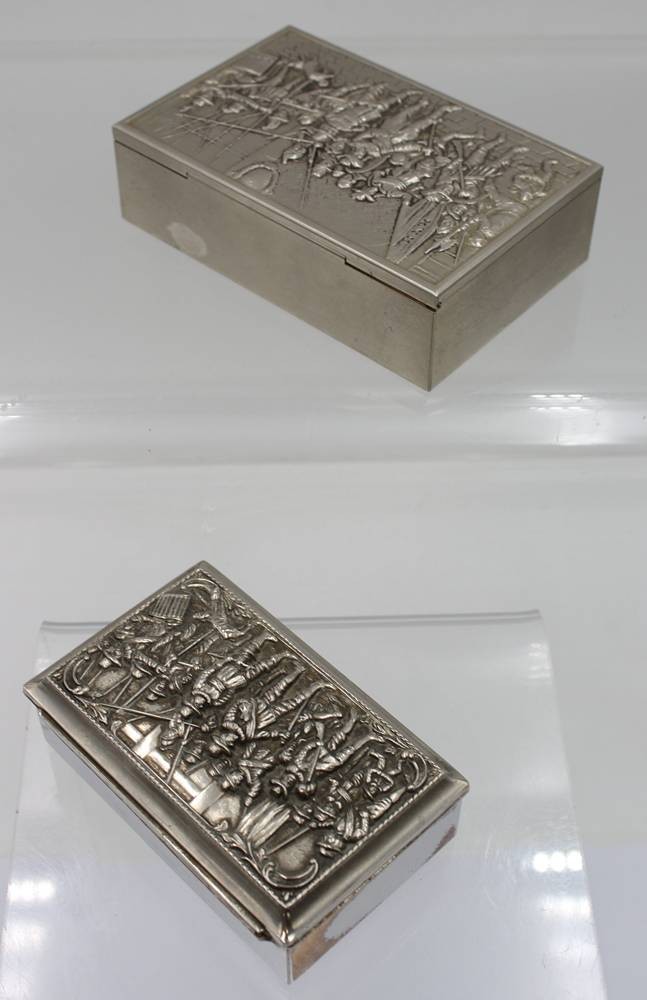 2x div. Metalldosen, Landsknechtszenen, älter, Größte ca. H-3,5cm B-12cm T-8cm [1]