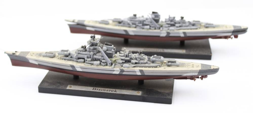 2x kl. Schiffmodelle der Bismarck, Metall, 1x beschädigt, ca. L-19cm
