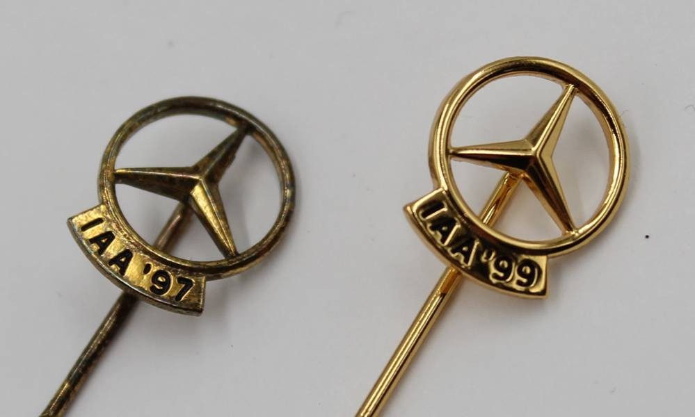 2x Mercedes-Nadeln, IAA 97 u. 99, 835/925er Silber, ca. L-5cm [1]
