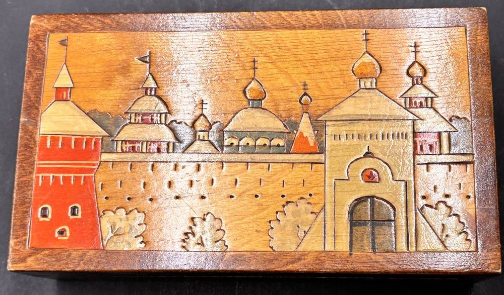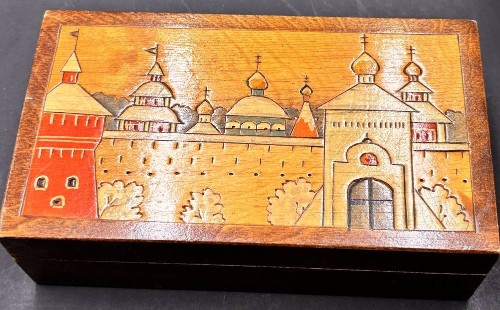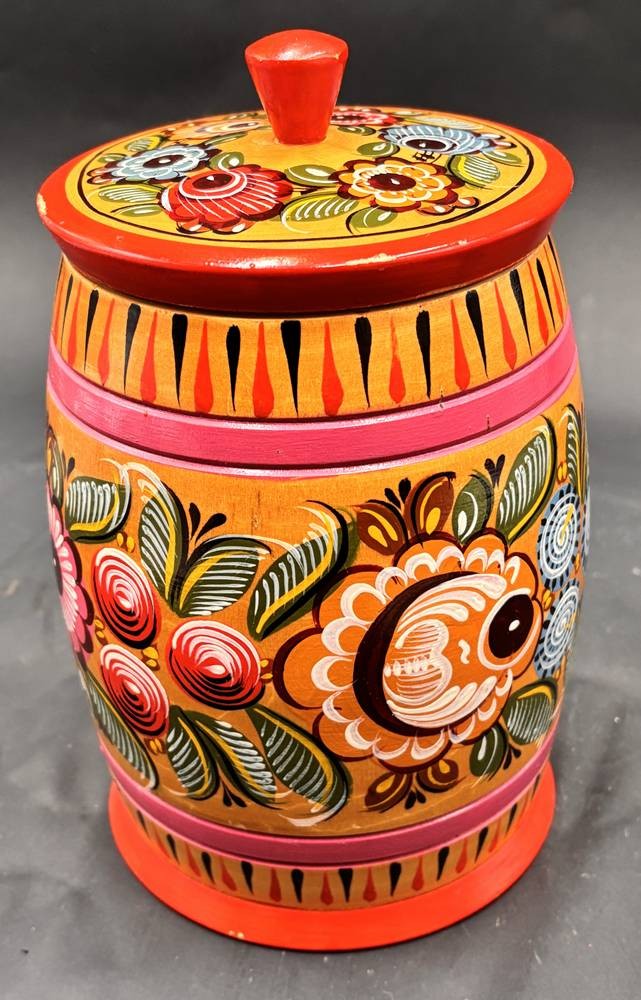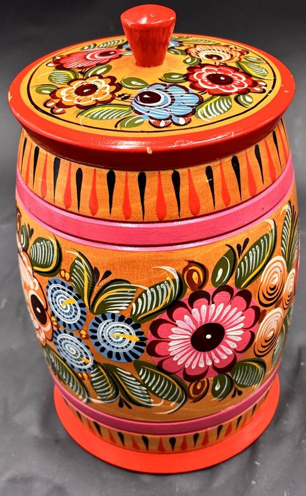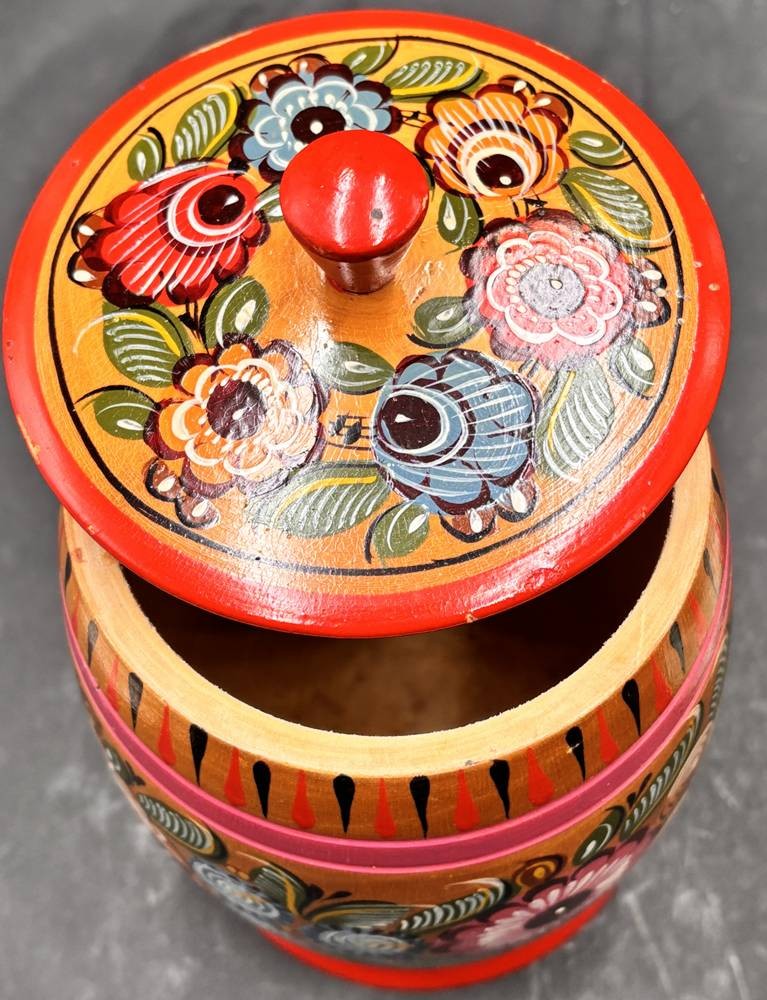 2x russische Volkskunst-Handarbeiten, runde und flache Deckeldose, H- 20 cm und 5,5 cm [1]