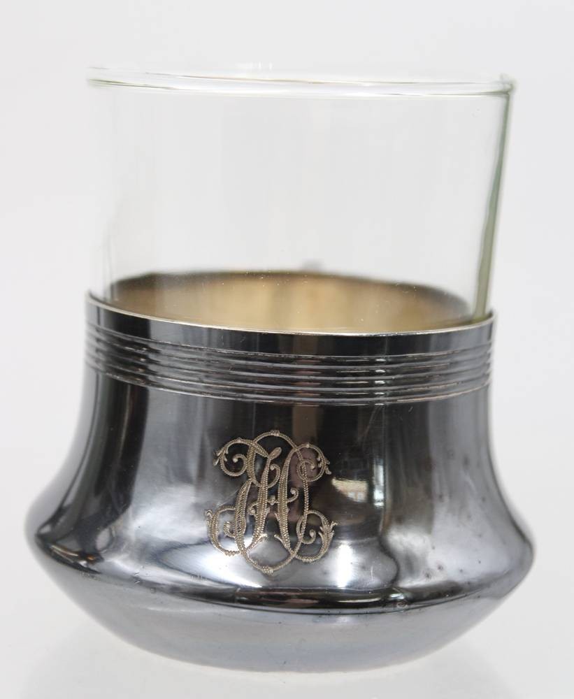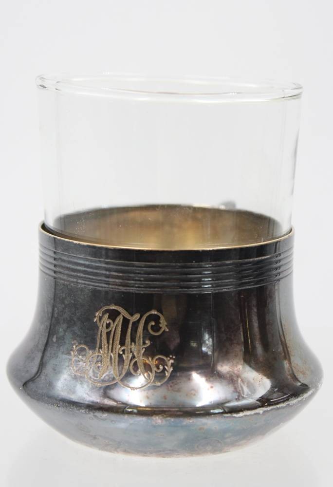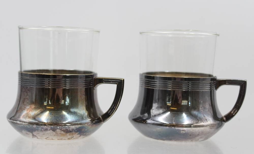 2x Teeglashalter um 1910, WMF Straussenmarke, Ziermonogramm, je ca. H-9cm [1]