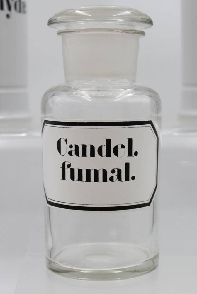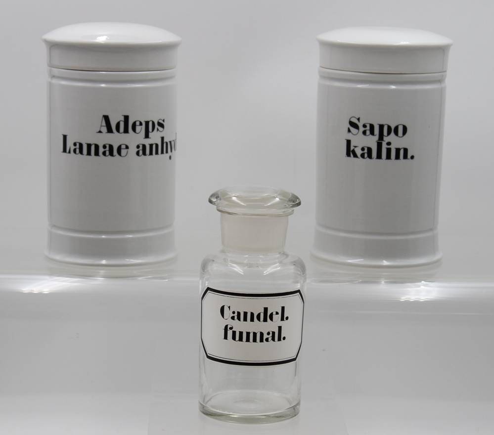 3x Apotheken-Gefässe, 2x Porzellan 1x Glas, je beschriftet, ca. H-17,5 bis 19,5cm