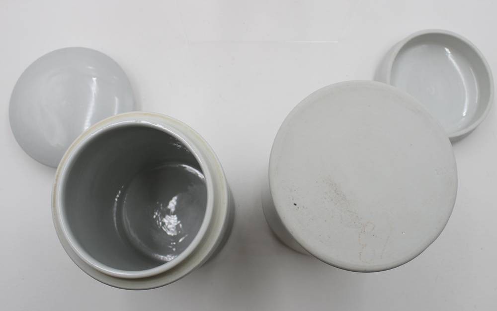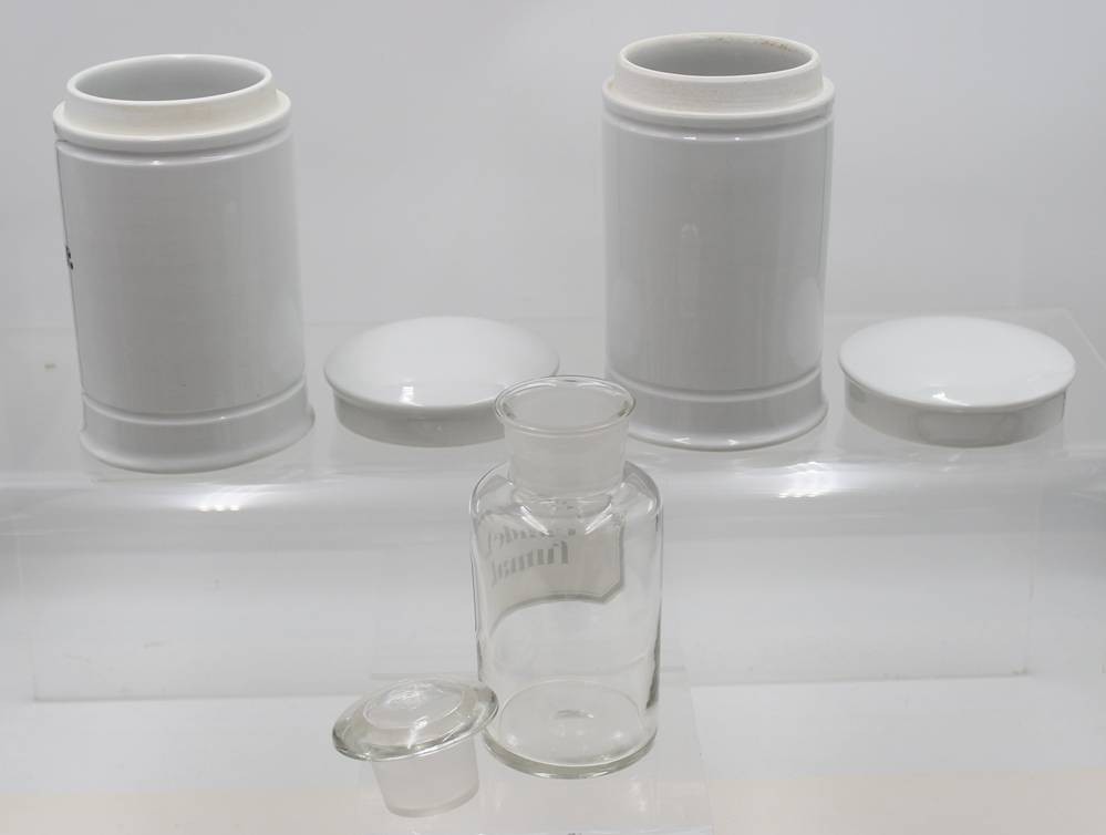3x Apotheken-Gefässe, 2x Porzellan 1x Glas, je beschriftet, ca. H-17,5 bis 19,5cm [1]