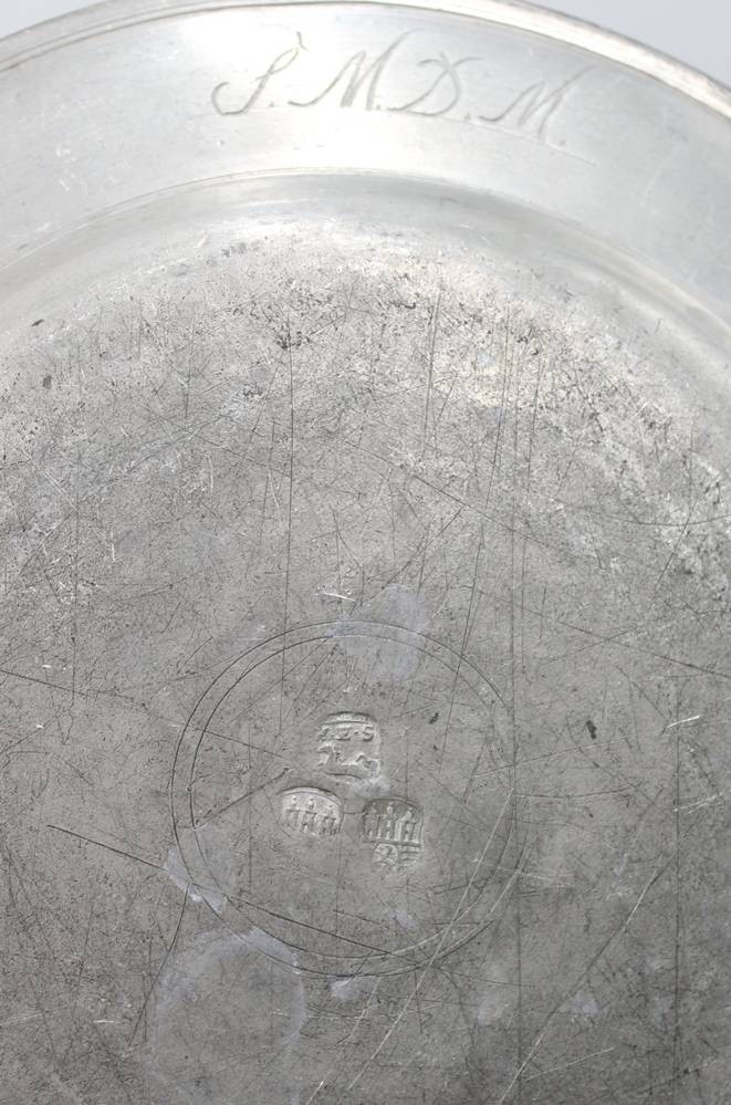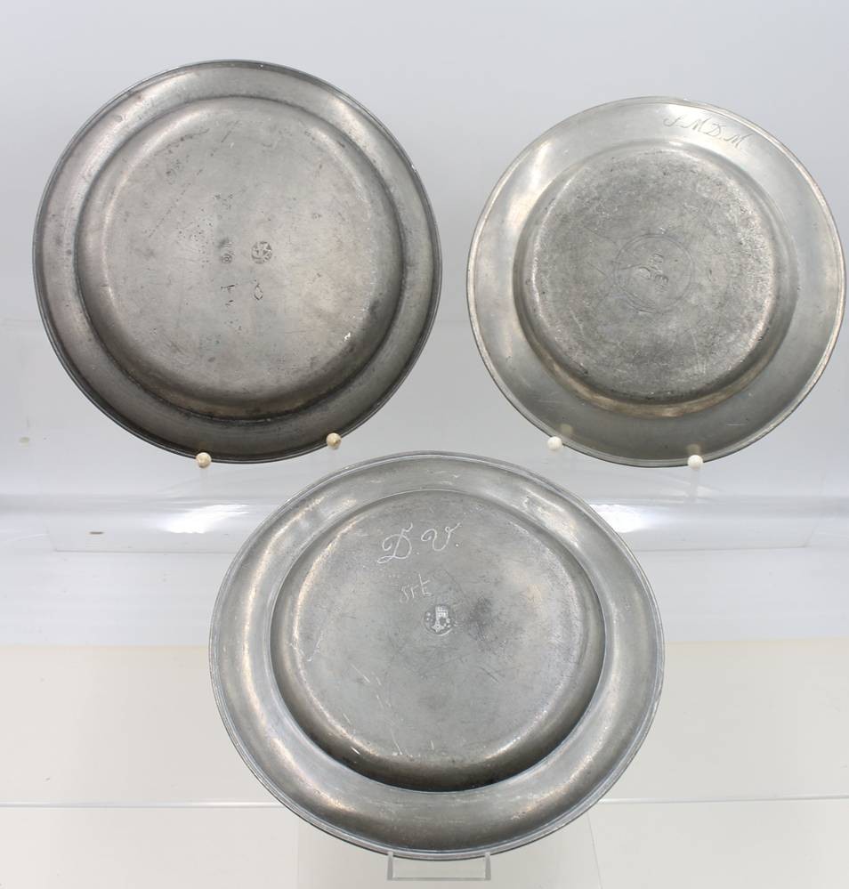 3x flache Teller, Zinn, 18./19. Jhd., unterschiedliche Punzierungen, ca. D-24cm [1]