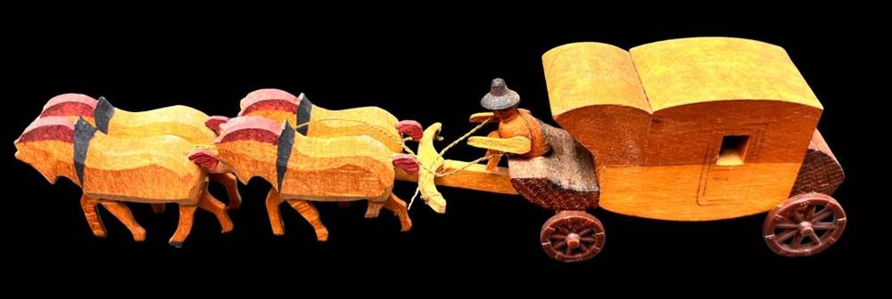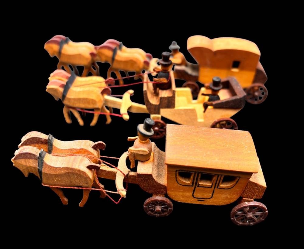 3x kl. Holzkutschen, H-ca. 3,5 cm, L-max 15 cm, 1x gemarkt "hergestellt in der DDR" [1]