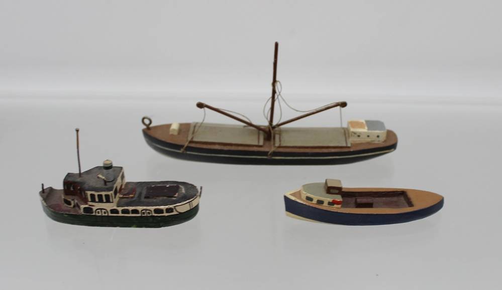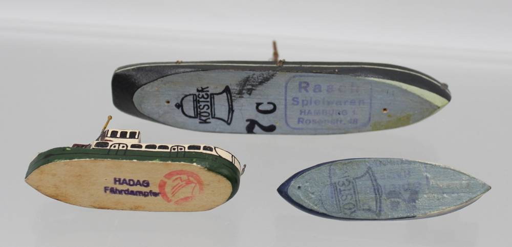3x kl. Holzmodelle, 2x gemarkt "Köster", Vorkrieg, Frachter ca. H-6cm L-12,5cm [1]