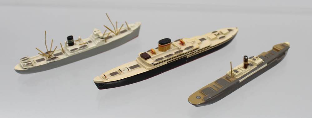 3x Schiffsminiaturen, Wiking, älter, Passagierschiff und 2 div. Frachter, ca. L-12,5cm