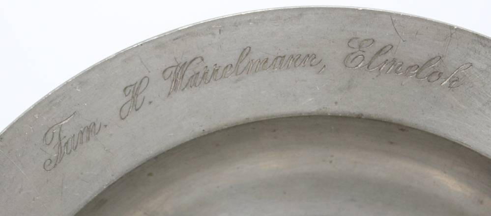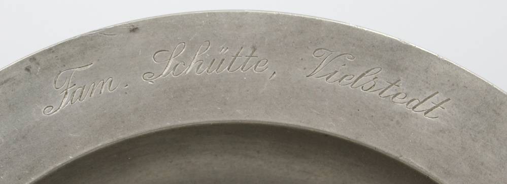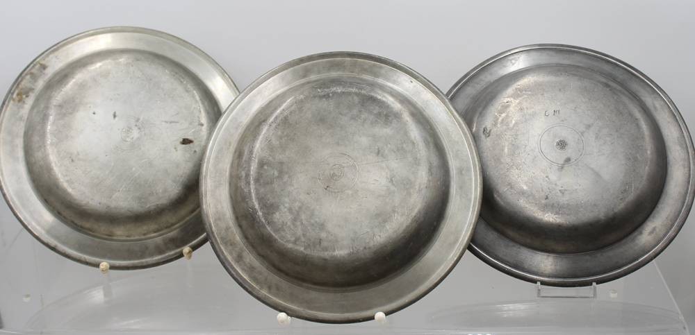 3x tiefe Zinnteller, 19. Jhd., 2x mit Namensgravuren, ca. D-24cm [1]