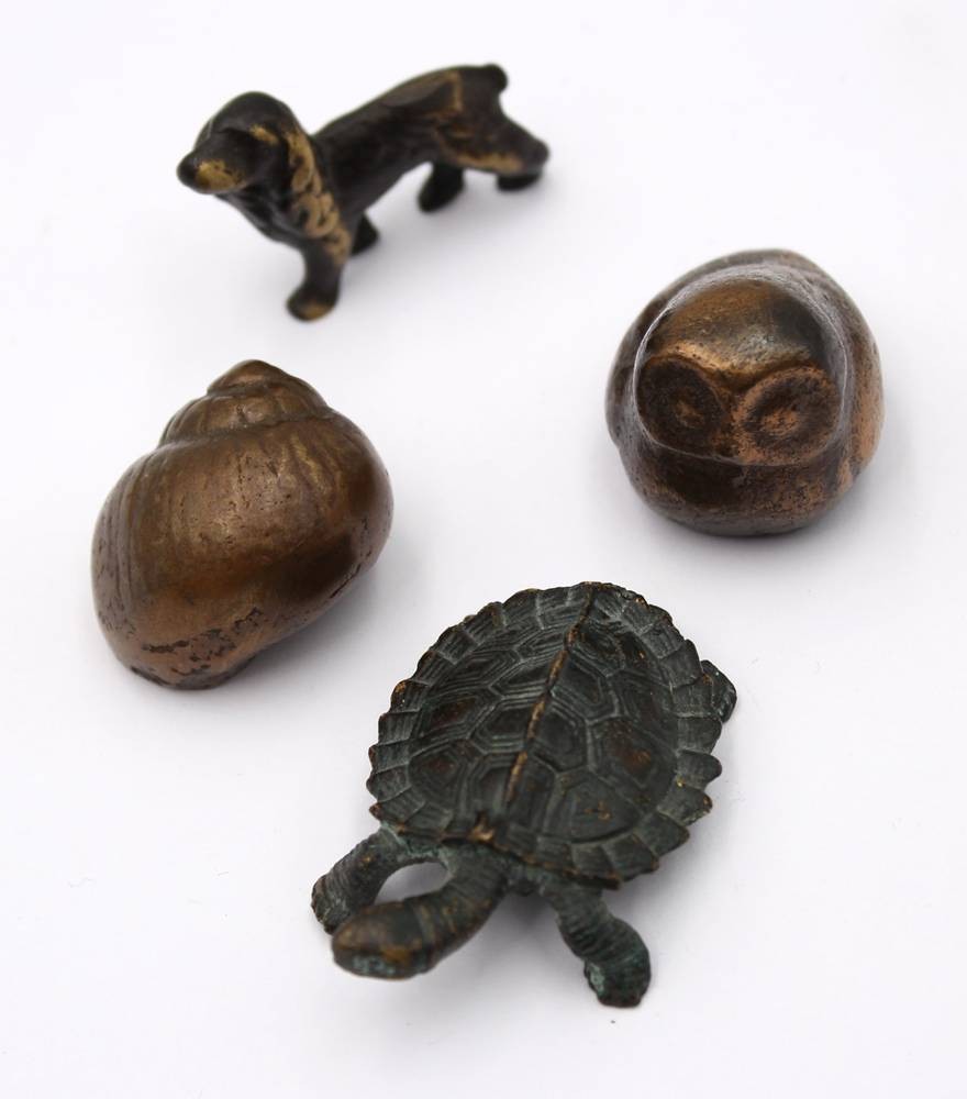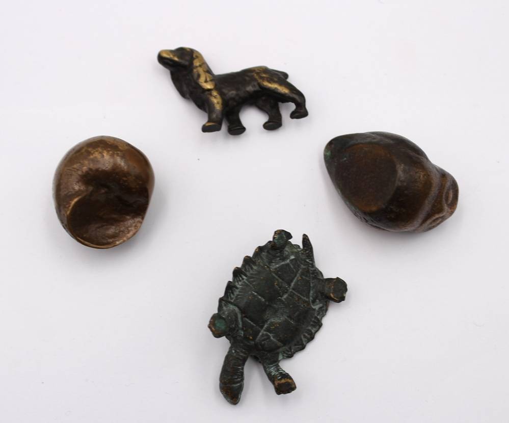 4 kl, Bronze-Figuren, ca. H-3,5cm, Muschel, Schildkröte, Eule und Hund [1]