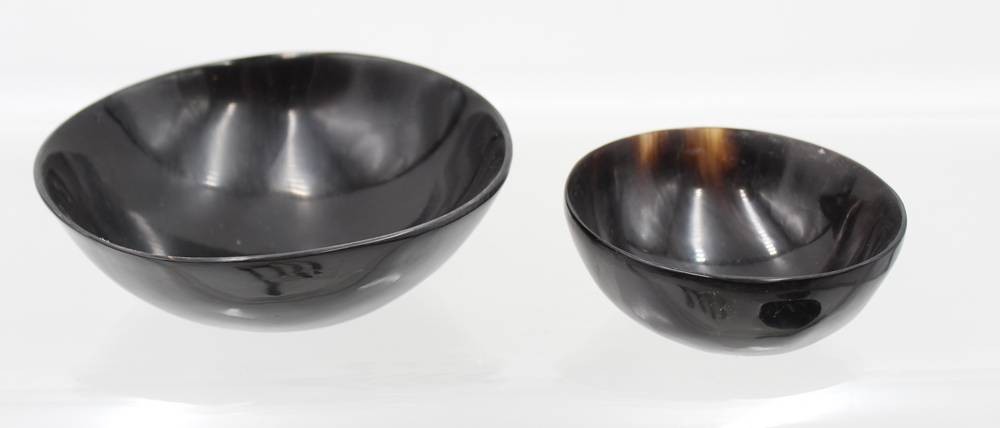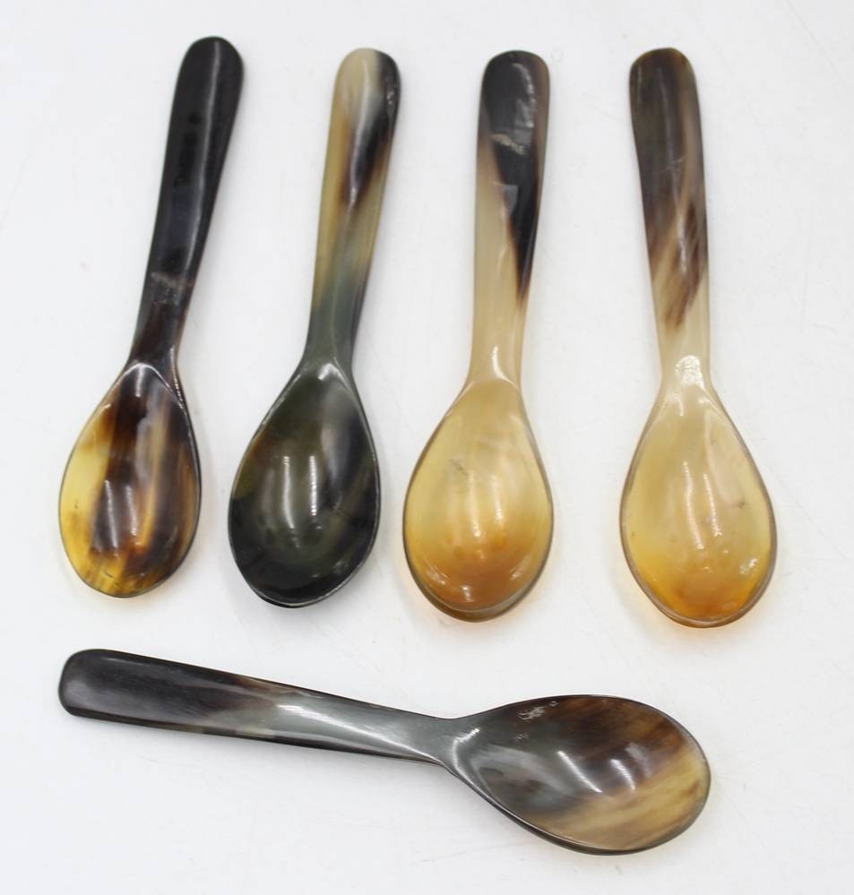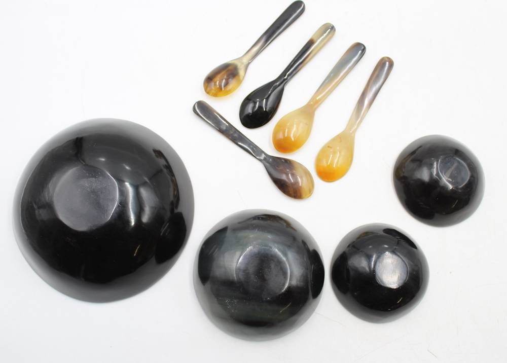 4 Schalen und 5 Löffel, Horn, älter, Schalen D-14,5 bis 8cm, Löffel L-12,5cm [1]